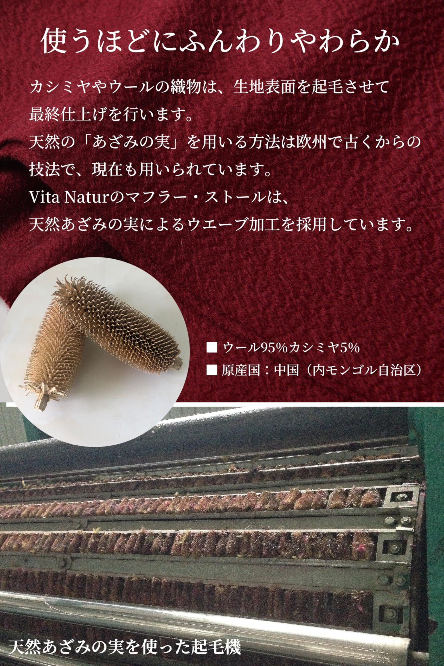 【柔らかウールを天然あざみの実でウエーブ加工】Vita Naturでは、太い差し毛を取り除いたウールにカシミヤをブレンドしています。織物は生地の表面を起毛させ最終仕上げをします。その風合いの良さが生地の評価を大きく左右します。一部柄によりブラシなどでの加工も行いますが、基本Vita Naturのカシミヤマフラー・ストールは天然あざみの実でのウエーブ加工をしています。