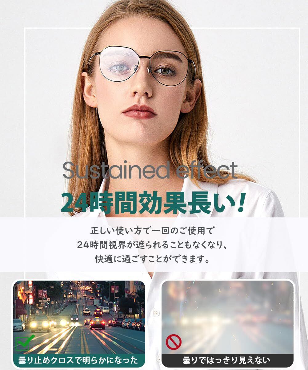 【一日一回効果持続】メガネくもり止めは正しい使い方で一度使ってから、24時間以上も効果が持続します。メガネ拭きを朝に一度拭くだけで、1日中快適な視界にキープすることができて、いつでもクリアな視界をしめます。※使用環境により効果・持続時間が異なります。