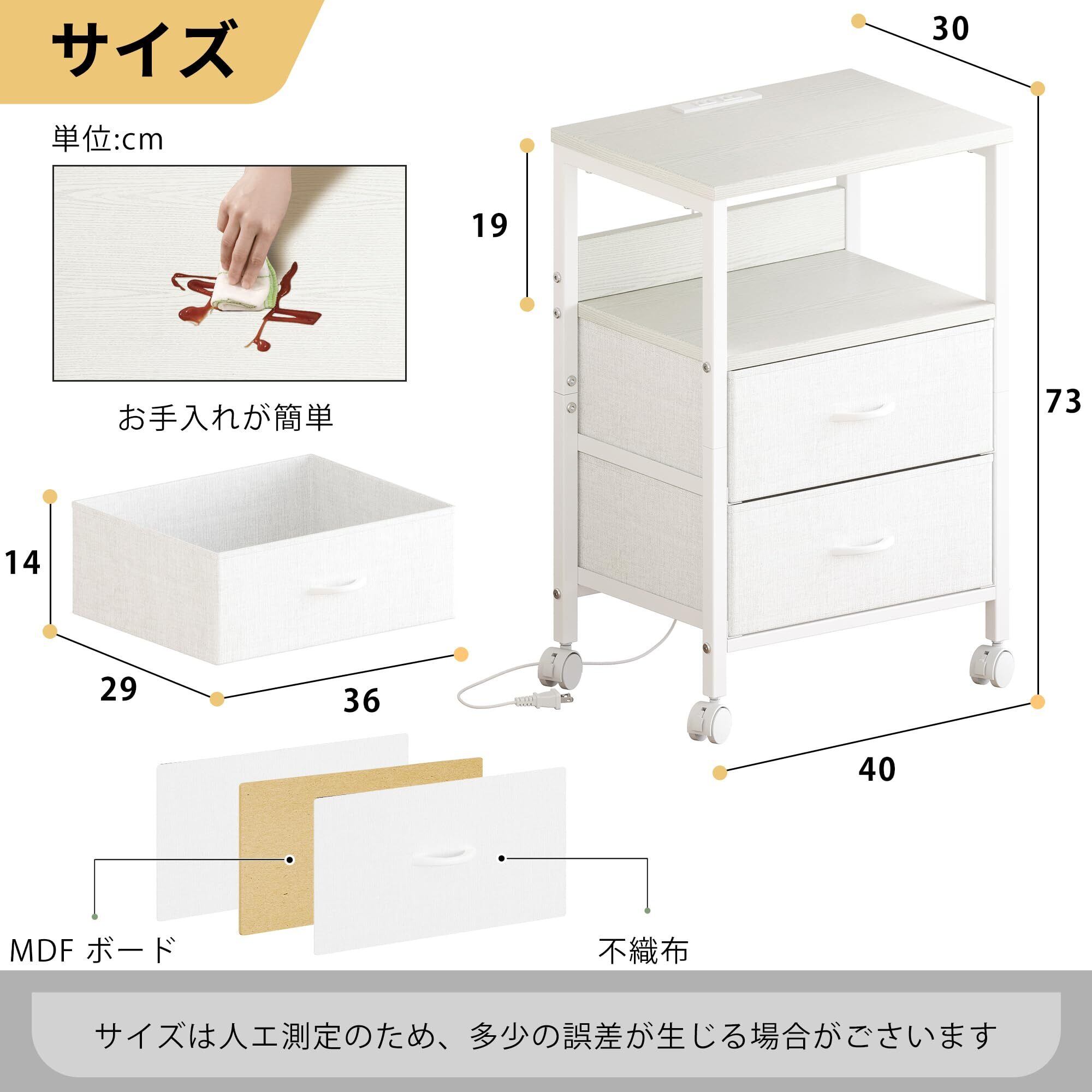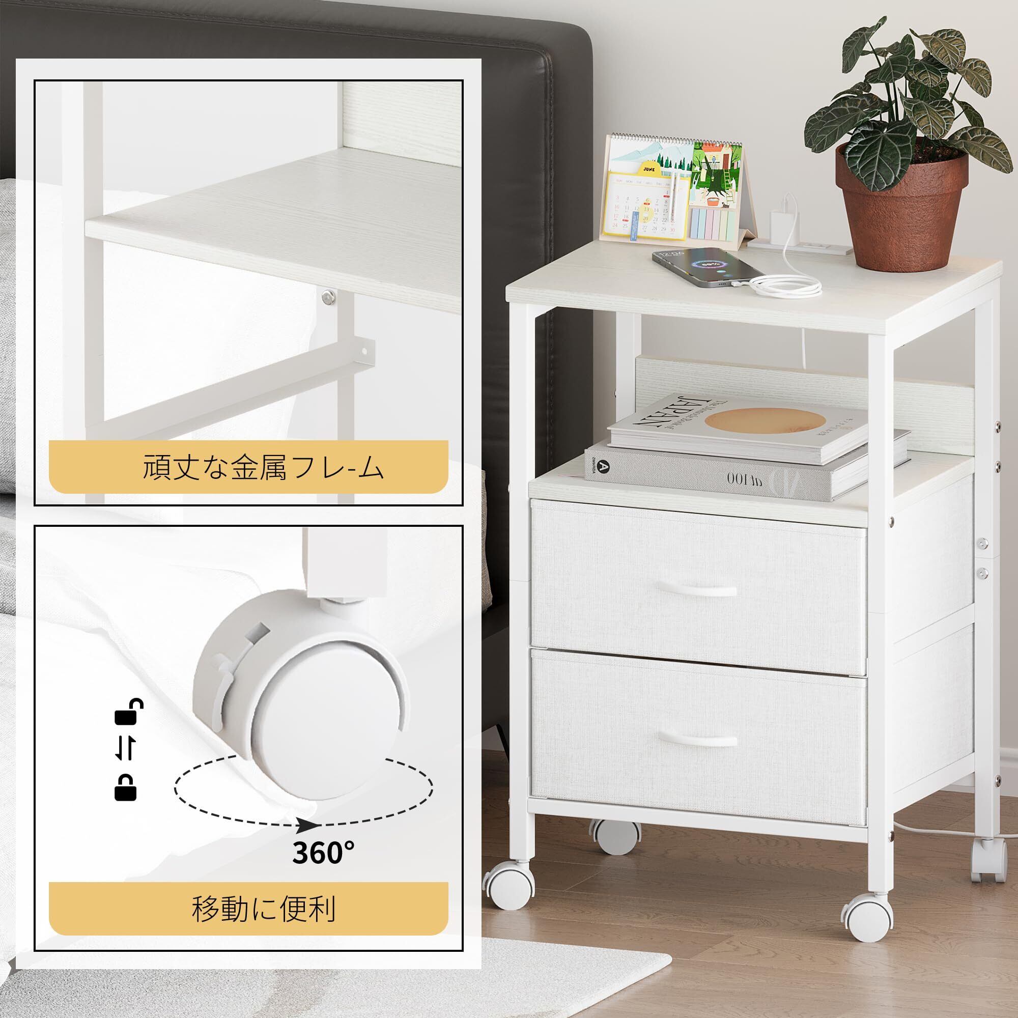 【特価セール】サイドテーブル キャスター付き ナイトテーブル 2つ引き出し付きのベッドサイド テーブル コンセント付き 可移動ナイトテーブル ベッド横 テーブル 北欧 洋服 タンス 天板付き (白, 幅40×奥行30×高さ63cm)