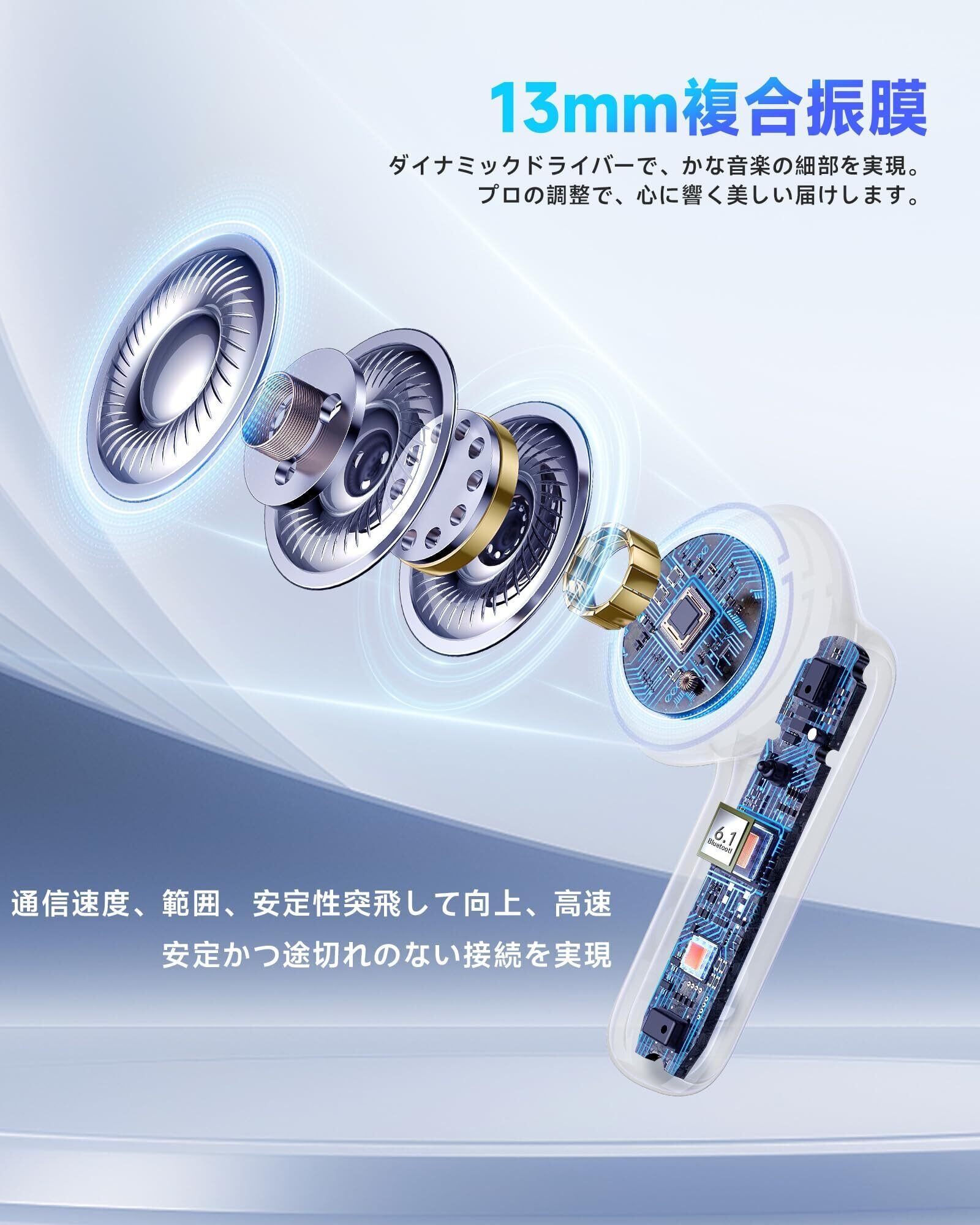 【最新Bluetooth 6.1技術 & 超低遅延】 ワイヤレスイヤホンは革新的なBluetooth 6.1高性能チップを搭載し、ワイヤレスオーディオの遅延を最大50ms(0.05秒)まで低減。高速ペアリングと安定した接続を実現し、通信の途切れを心配する必要はありません。ケースのフタを開けてQ10イヤホンを取り出すだけで、自動的にペアリングが開始される便利な設計を採用。さらに、先進のアンテナ技術により、10メートル範囲で高速かつ安定した通信を提供します。このインイヤー Bluetoothは、Bluetooth機能を備えたさまざまなデバイスに対応。iOSおよびAndroid搭載のスマートフォン、パソコンなど、多様な機器でシームレスにご利用いただけます。