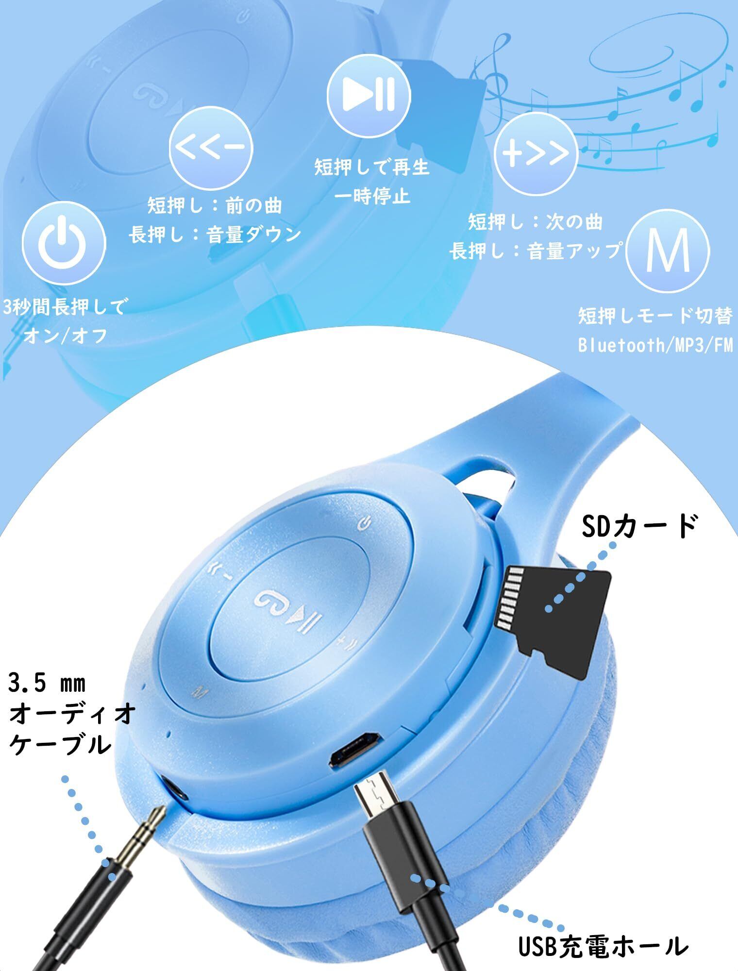 子供用ヘッドホン Megadream無線/有線ヘッドホン マイク付き 猫耳LEDライト/両側RGBライトデザイン Bluetooth5.0/ワイヤ長 1m TFカード挿入可能 折りたたみ式 サイズ調節可能 学校/タブレット/旅行/MP3 (グラデーション・青)