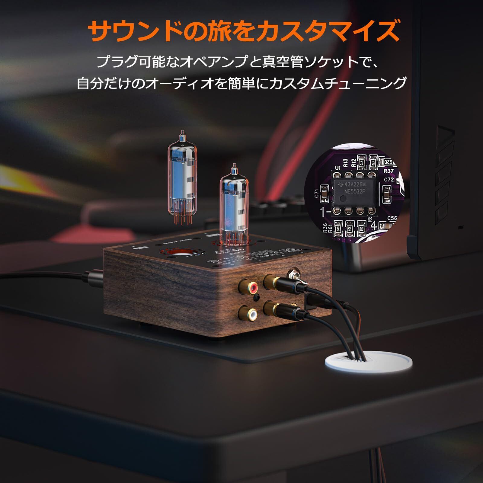 【真空管サウンドのカスタマイズ性】: 差し替え可能な6A2真空管×2本とプラグイン式NE5532 OPアンプを採用。OPアンプは4558/JRC2068/2064/MUSE01S/2111等との互換性あり。半田付け不要のモジュール設計で、ユーザーが好みの音色を自由にチューニング可能。真空管交換時の安全確保のため、専用ヒートシンクと高耐圧ソケットを装備しています。