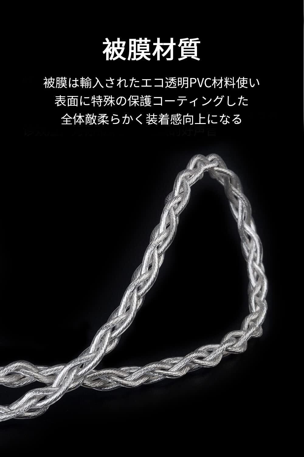 【銀線リケーブルの入門にもオススメ】本製品は、8芯の高品質 純銀 ケーブル です。音質については8芯ながら99.99%の純銀度のおかげで、純銀線特有の特徴が強く出ている、音声信号伝送における抵抗を低減し、高音の細さがすごくサウンドステージも広いし低音も深い低音がでます。さらに音質面だけではなく、プラグとコネクタ部分の鏡面の美しさやコネクタ部分の根元がしっかり固定されており皮膜や8芯のクリスタルのように透き通った被覆など繊細なところまで見た目にも答えました
