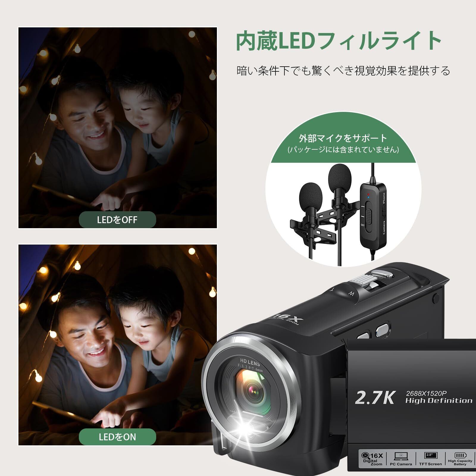 【2.7Kビデオカメラ·2.8インチ大画面·フラッシュ·16X デジタル ズーム】2.7Kビデオカメラは、一般的な1080pや4Kよりも解像度が高く、高品質なビデオ録画を実現することが可能です。2.8インチ高清IPSスクリーンは、鮮やかな色彩とリアルな画質を再現し、撮影した写真や動画を快適に確認できます。カメラにはフラッシュが搭載されており、家族の集まりや夜間のイベントなど、明るみがない環境で撮影する際に、鮮明で明るい撮影効果を確保します。さらに、16倍のデジタルズーム機能と組み合わせることで、広大な風景から細部まで簡単に撮影することができ、さまざまな撮影ニーズに対応します。