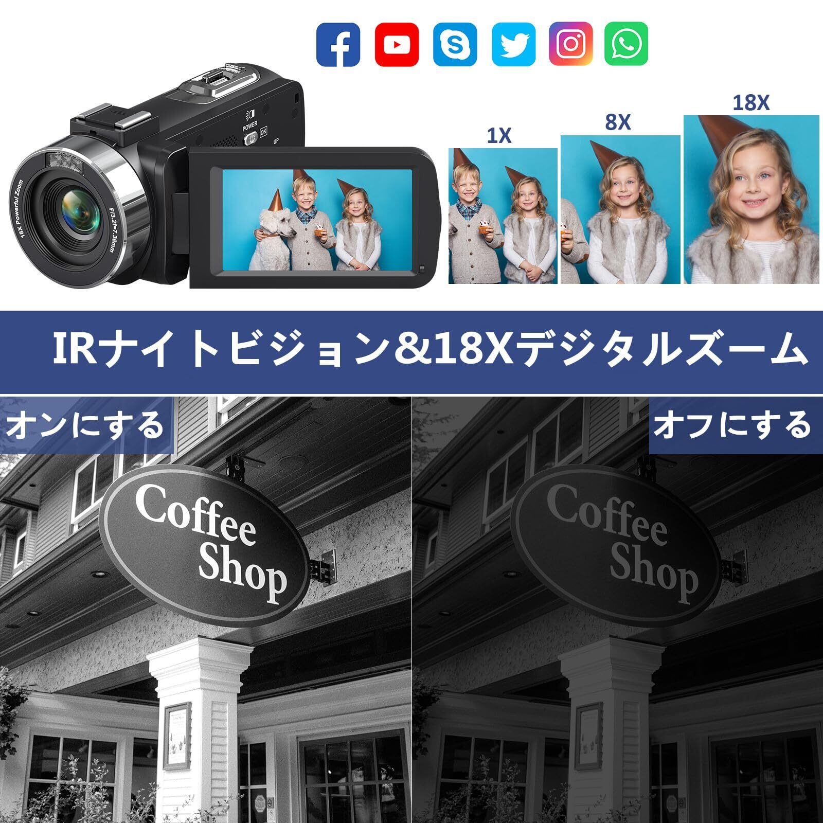 【IRナイトビジョン機能&18X デジタルズーム】この4KビデオカメラはIRナイトビジョン機能をサポートしており、暗い場所や暗い場所でも白黒画像やビデオを撮影できます。 自分の創造性を探求し、新しい視点から周囲の世界を捉えることができます。 18 倍デジタルズームを拡大すると、重要な詳細をすべて捉え、遠くの風景をより鮮明に表示できます。