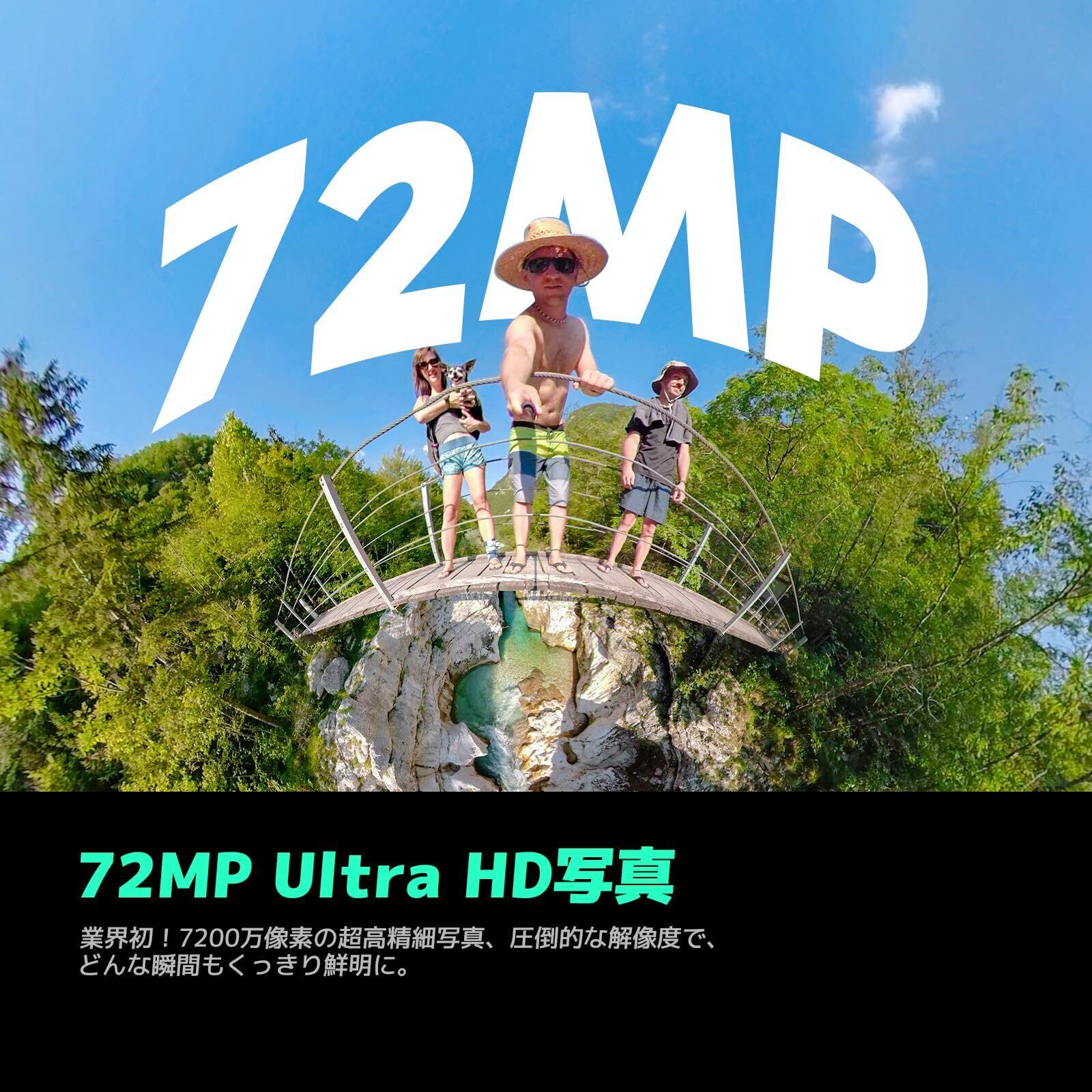 【より明るく、より精細に・72MP 360° 写真】当360度カメラは新型デュアル1/2インチセンサーを搭載して、細部までくっきりとした美しい映像を捉え、アクションを鮮やかに躍動させる。それに、DNG8 RAWフォトモードにより、暗い環境でも画質を向上させ、ダイナミックレンジと編集の自由度を高めます。7200万像素の超高精細写真、圧倒的な解像度で、どんな瞬間もくっきり鮮明に!