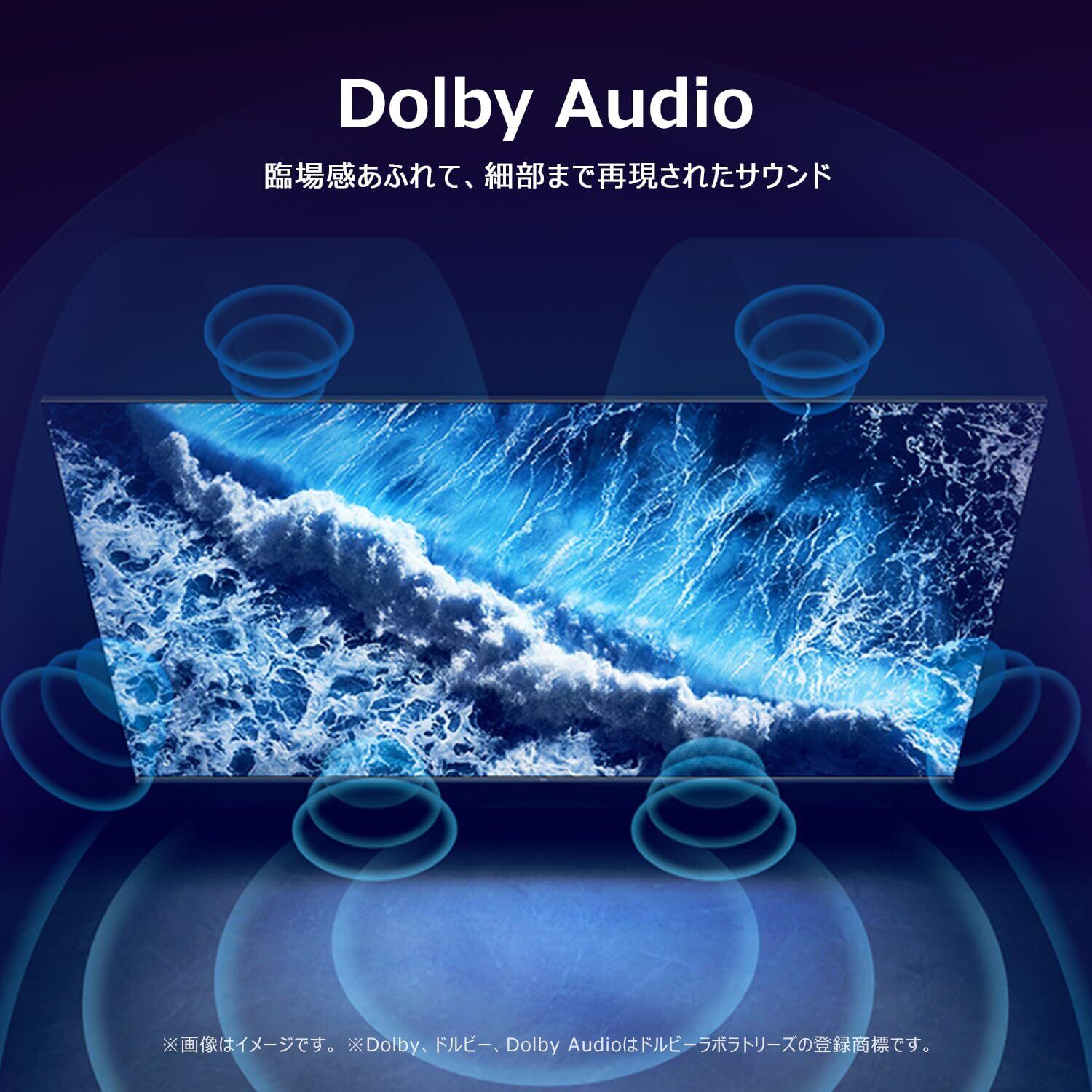 【臨場感のある音響】3次元のリアルな立体音響を実現する「Dolby Audio」に対応、部屋の隅々まで響き渡り、周囲や頭上を流れながら移動する、包まれるような音響体験をお届けします。