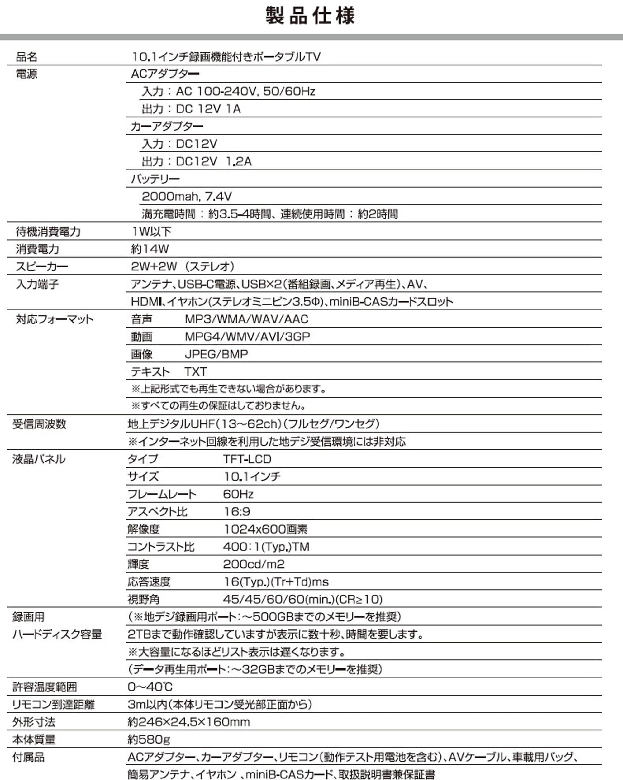 [入出力端子] AV入力・HDMI入力・イヤホン出力・アンテナ入力・USB端子×2・miniB-CASスロット