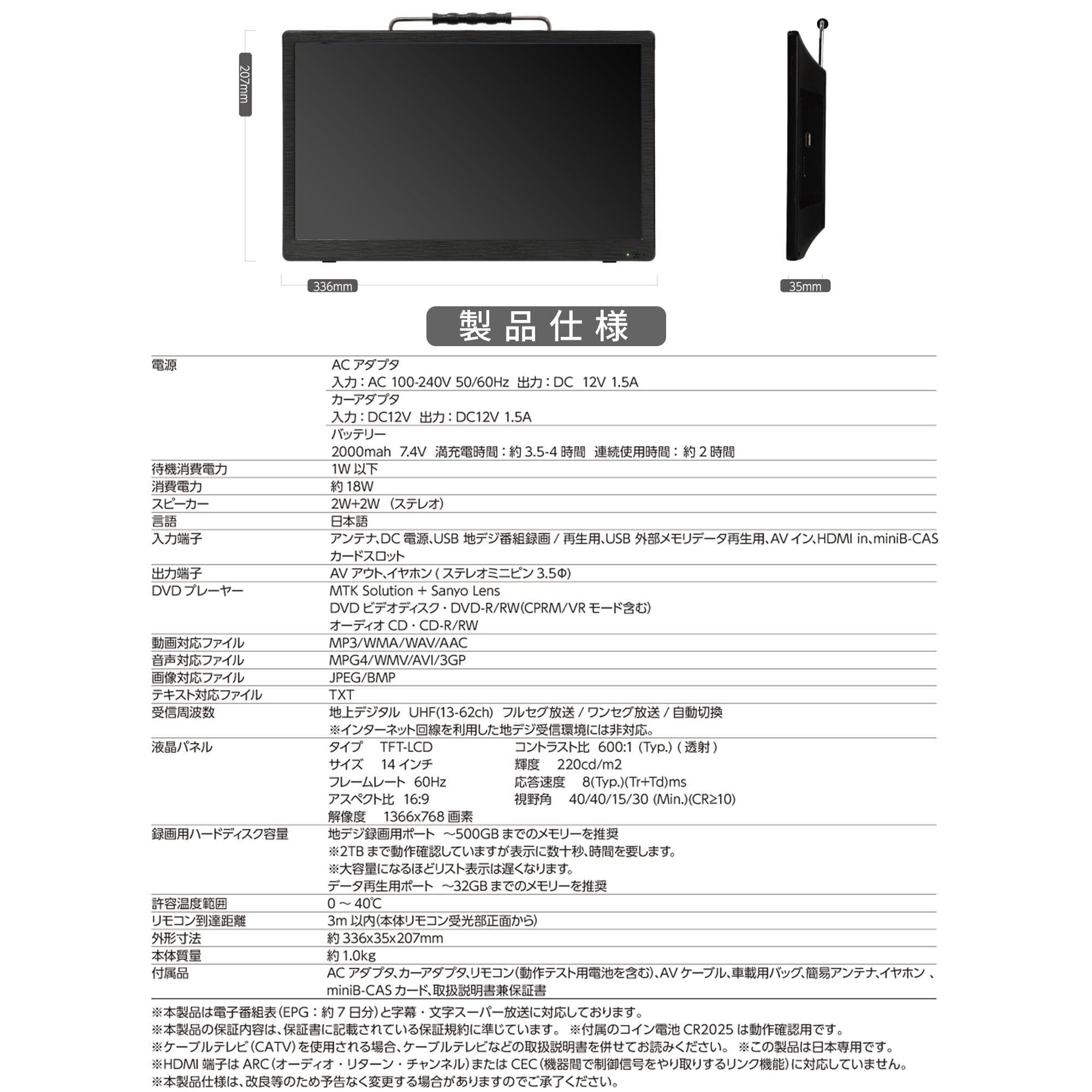 [東京Deco] 14型 液晶テレビ DVDプレーヤー内蔵 スタンドタイプ 車載用バック付属 アンテナ付き簡易 [3WAY電源(AC/DC/充電)][地デジ受信チューナー搭載モデル] ワンセグ メディア再生 CD録音 レジューム機能 USB AC/DC CPRM/VR リージョンフリー 180度回転 TV スクリーン 車 インチ 型 9 10 12 14 15 o000