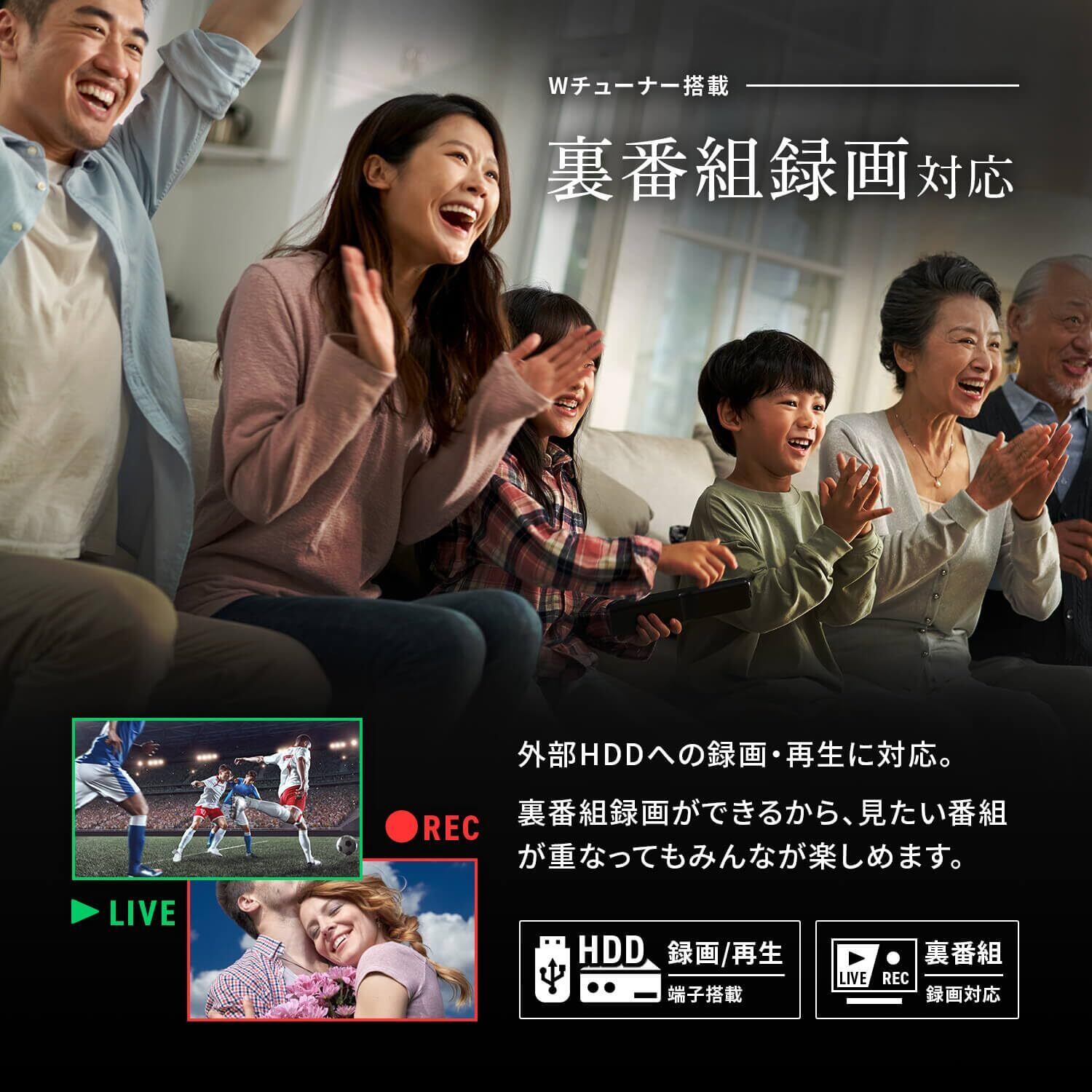 [主な機能] USBハードディスク録画、裏番組録画、ブルーライトガード、イコライザー、自動チャプター、JPEG再生