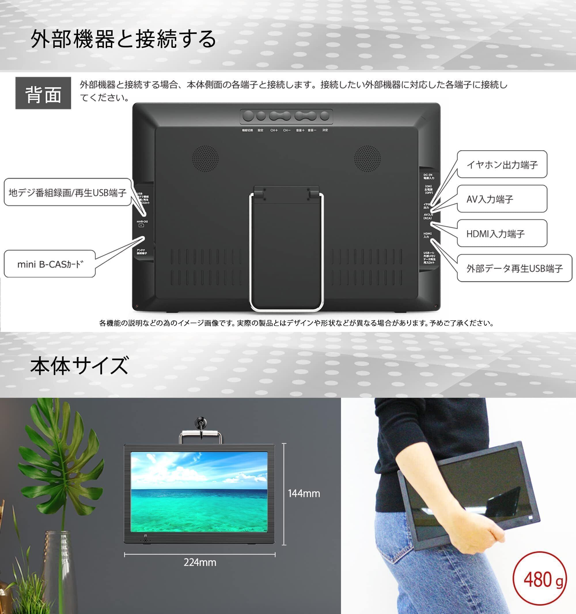 ▼9インチ 録画機能付きポータブルテレビ手軽に持ち運べて大画面で視聴ができるポータブルテレビ。簡易アンテナ付きなので、アンテナ端子がない部屋でも視聴可能です。利用シーンも設置スタイルも自由自在、場所を選ばず、好きな時に好きな場所で楽しめる多機能ポータブルテレビです。▼ワンセグ⇔フルセグ 自動切換使用時の電波状況に合わせて自動で切替対応をしてくれます。受信データが少ないワンセグは、移動中やレジャーでもきちんと映像を届けてくれるので、お好きな場所でお楽しみ頂けます。また、フルセグは高画質の映像が楽しめるため、ご家庭でTV放送やDVDをじっくり鑑賞して頂けます。▼地デジ受信&録画可能!外部メモリーに視聴中の番組を録画可能!感動的なシーンや、お気に入りの番組をいつでもじっくり見直せます。また、地デジチューナー搭載なので、好きな時に好きな場所でテレビが視聴可能! さらに8日分のEPG番組ガイドが表示できます。▼3電源に対応!家中どこでも!屋外でも![ACアダプター]リビングはもちろん、キッチン、子供部屋などコンセントがある場所ならどこでも使える。液晶モニターは吊り下げ、スタンド置きと場所を選ばず設置して頂けます。[車載用DCアダプター]車のヘッドレストへ簡単に設置ができる車載用バッグを同梱しているので、ドライブの渋滞なども退屈せずに車内の空間が快適に楽しめます。また2000mAh内蔵で、長時間視聴可能!続けて見たいときにも安心です。[内臓バッテリー]屋外でも使用可能!アウトドアでもテレビやDVD、音楽、写真などを快適に楽しむことが出来ます。▼様々な機能を多数搭載[便利なHDMI入力搭載]搭載されているHDMI端子を機器と接続すれば、PCのサブモニターや動画配信サービスのコンテンツの再生用モニターなど用途に応じて幅広く楽しめます!また、放送中のTV番組を外部メモリーに録画することが可能です。[豊富な接続端子]どのご家庭でも使いやすい豊富な接続端子保存した動画や音楽、画像などのメディアを再生することが可能です。[REC機能付き]放送中のTV番組を外部メモリーに録画することが可能です。長い移動時間が伴う出張や旅行の際にも、ゆっくり好きなだけ楽しんで頂けます。[消費電力]約14W[視野角]45/45/60/60[内蔵電源]種類:リチウムイオンポリマー再生時間:約 2 時間 充電時間:約3.5~ 4 時間※充電/作動時間は使用環境により変化します。[スピーカー出力]2.0W×2[テレビ受信チャンネル]フルセグ/ワンセグ自動切替 UHF 470-770MHz (13-62ch)[EPG番組ガイド]8日[録画機能]外付けHDDまたはUSBで録画可能[出入力端子]・AV入力端子・HDMI入力端子・イヤホン出力端子・アンテナ入力端子・miniB-casスロット・USB2.0端子×2(録画用/データ再生用)※地デジ録画用端子推奨メモリー容量:~500GB※データ再生用端子推奨メモリー容量:~32GB[ファイル形式]音楽:MP3/WMA/WAV/AAC 画像:JPEG/BMP動画:MPG4/WMV/AVI/3GPテキスト:txt[推奨動作温度]0~40℃