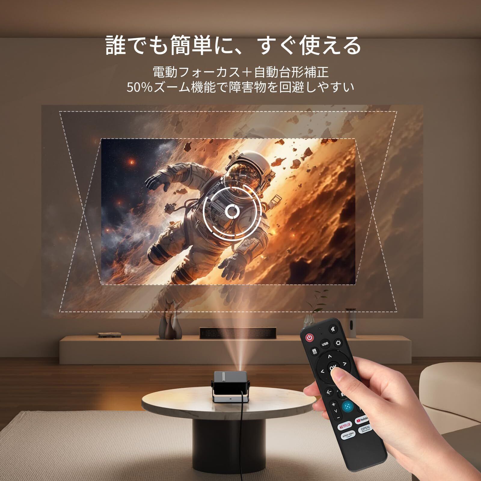 【0.5mの超短距離投影+自動台形補正】一般的なプロジェクターとは一線を画し、MX1はわずか0.5mの距離からでも大画面を投影できる「超短距離投影」に対応。小さな部屋やベッドサイド、ワンルームや車内など、限られた空間でも大画面を楽しめるため、設置場所に悩む必要がありません。1080Pの高解像度と600ANSIルーメンの明るさで、文字も映像もくっきりと鮮明に表示されます。さらに、±45°の自動台形補正と電動フォーカス機能を搭載しているため、面倒な設定は一切不要!起動後すぐに画面が自動で調整され、焦点もリモコンで細かく調節可能。斜めからの投影や高さの違いにも対応し、プロジェクター初心者の方でも迷うことなく美しい映像をすぐに楽しめます。