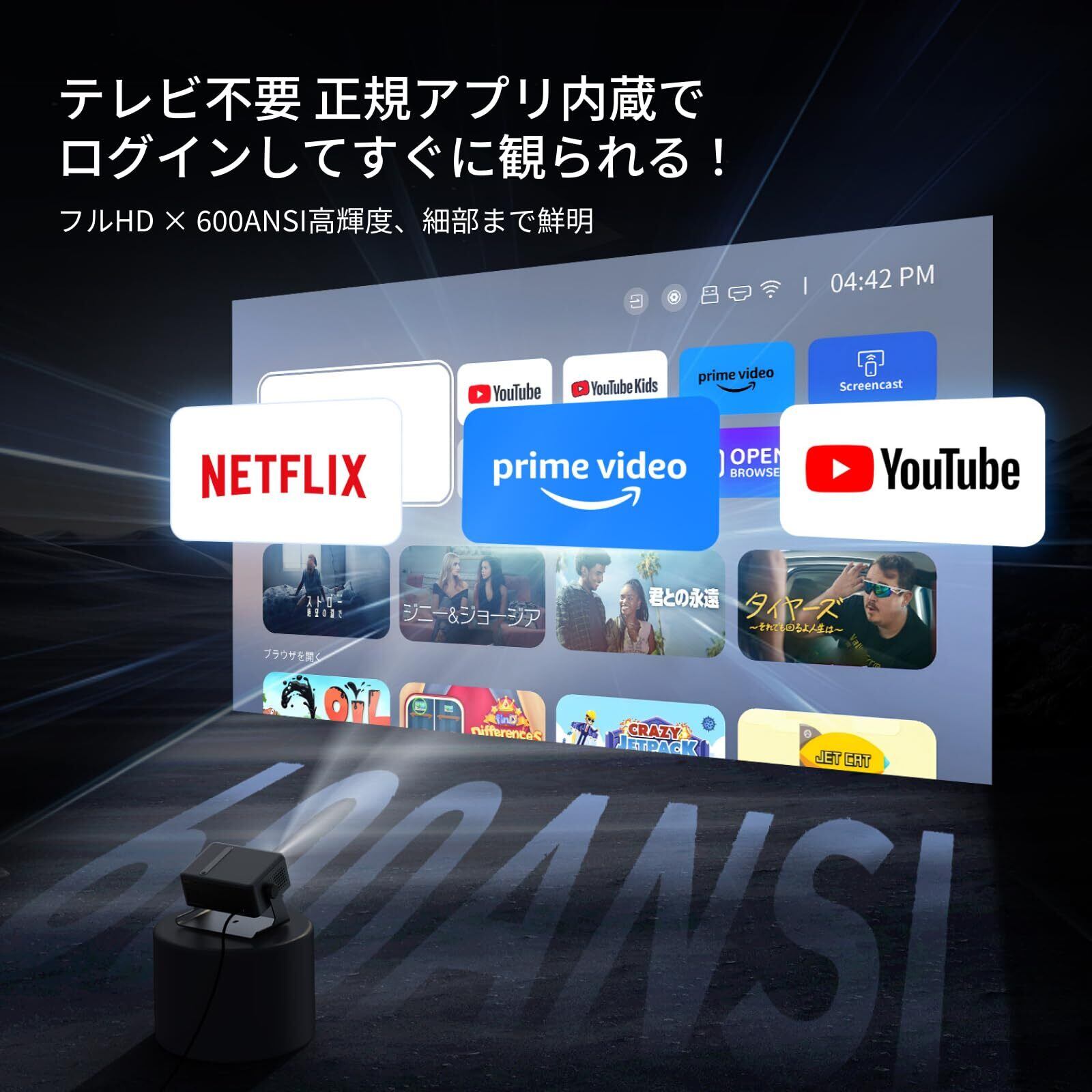 【公式アプリ搭載ですぐに視聴可能】MX1家庭用プロジェクターは、Netflix、Prime Video、YouTubeなどの公式認証アプリを内蔵しているため、面倒な設定なしで、電源を入れるだけですぐに大画面でコンテンツを楽しめます。さらに、Disney+、Huluといった人気のストリーミングサービスも手軽にダウンロード可能。外部デバイスを接続する手間なく、映画やアニメをすぐに視聴できるのが魅力です。アカウントログインや日本語字幕の切り替えにも対応しており、操作画面は非常にシンプルでスムーズ。サードパーティ製OSにありがちな強制終了やアップデート不可といった心配がなく、安定した快適な視聴体験を長く提供します。また、「テレビ番組も見たい」という方には、地上波チューナー内蔵のテレビボックス(別売)をHDMI端子に接続するだけで、通常のテレビ視聴も可能です。システムの定期アップデートにも対応しているため、常に最新の状態で安心してお使いいただけます。