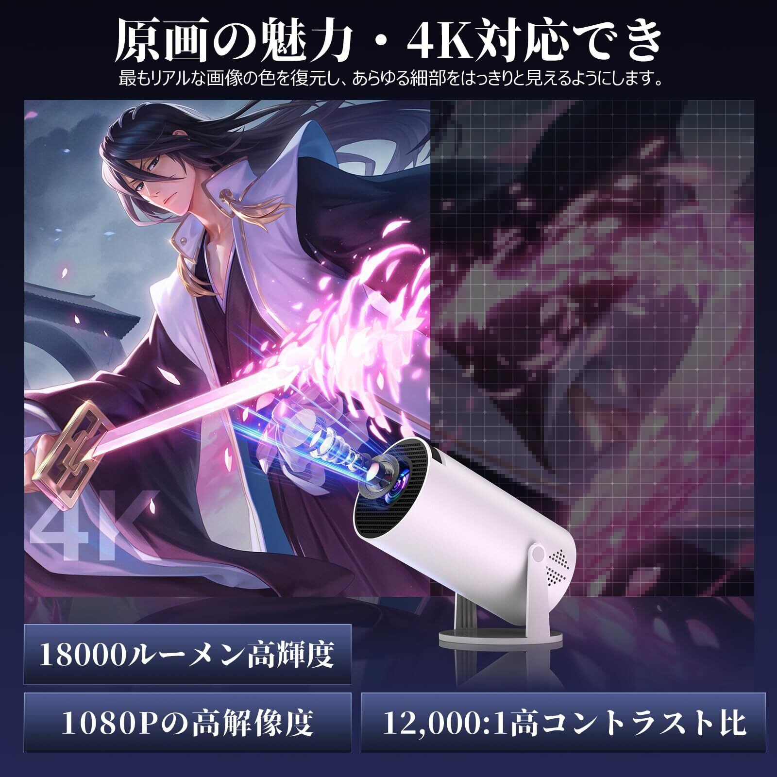 プロジェクター 家庭用【270°回転・18000LM・4K対応・Android TV搭載 最新登場! PSE認証済み】 プロジェクター 小型 高輝度 リアル1080P 天井投影 Wi-Fi6瞬間接続 Bluetooth5.4 HiFiスピーカー内蔵 自動台形補正 短距離投影 大画面 スタンド一体型 軽量 スマホ/パソコン/PS機など接続可 日本語取扱説明書 (ホワイト)