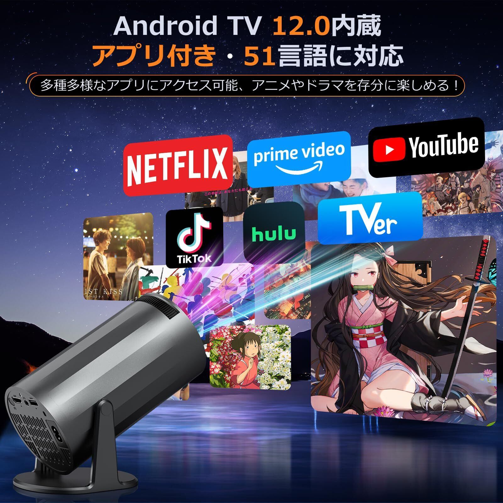 【Android TV12.0搭載・大画面・短距離投影】このホームプロジェクターはAndroid TV 12.0を搭載し、Prime Video、YouTube、Netflix、Disney+、Hulu、TVerなどの主要プラットフォームにアクセス可能です。8,000以上のアプリから選び、60万本を超える映画やテレビ番組をお楽しみいただけます。Google PlayストアやApp Storeからさらにアプリをダウンロードできるため、多様なエンターテイメントニーズに対応します。0.5~3メートルの短焦点投影により、狭い空間でも30~200インチの大画面を投影可能です。手軽にホームシアターを構築できます。システムは日本語、英語、中国語を含む51言語に対応し、全世界のユーザーの使用習慣に適合しています。詳細な日本語取扱説明書が付属するため、初心者でもすぐに操作を習得し、安心してご利用いただけます。