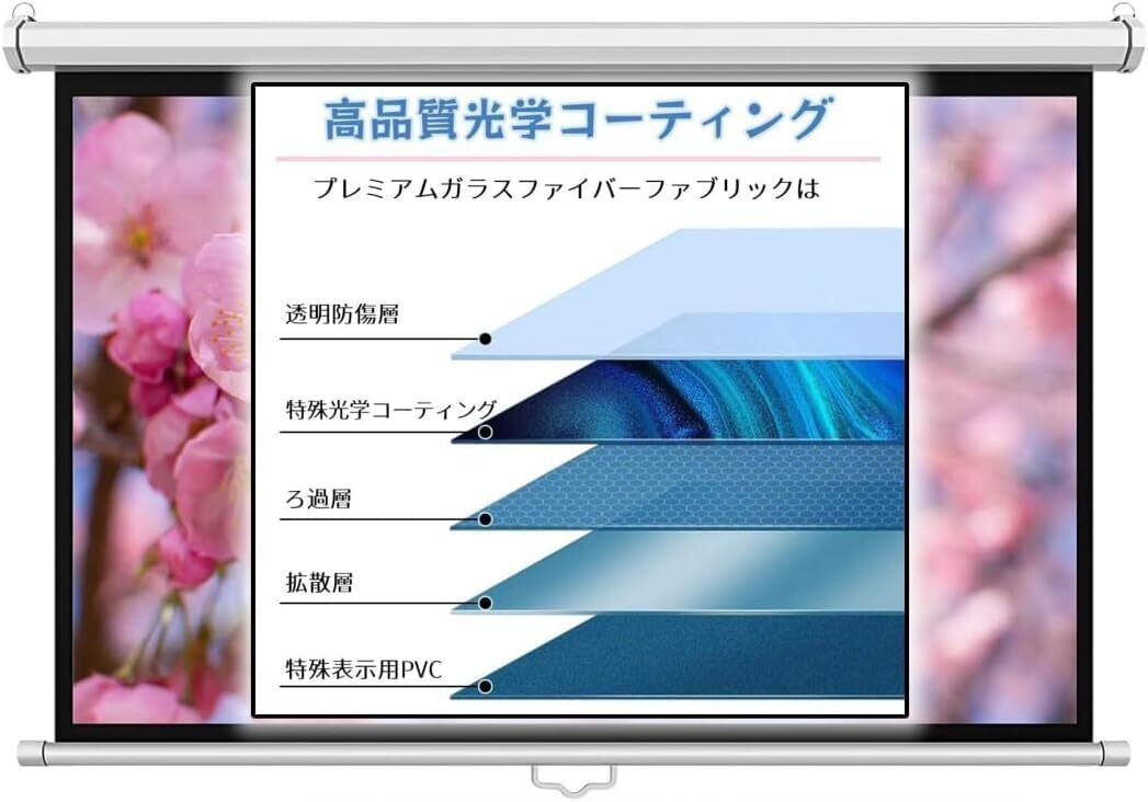 【優れた画質】プレミアムガラスファイバーファブリックは、シワができにくく、常に滑らかな画面でご利用いただけます。どの角度からも見やすい拡散型のスクリーンです。色彩の再現性とコントラストを向上させ、鮮明で生き生きとした映像を提供します。ご注意:サイズ測定では1-3cmの誤差があります。予めご了承ください。
