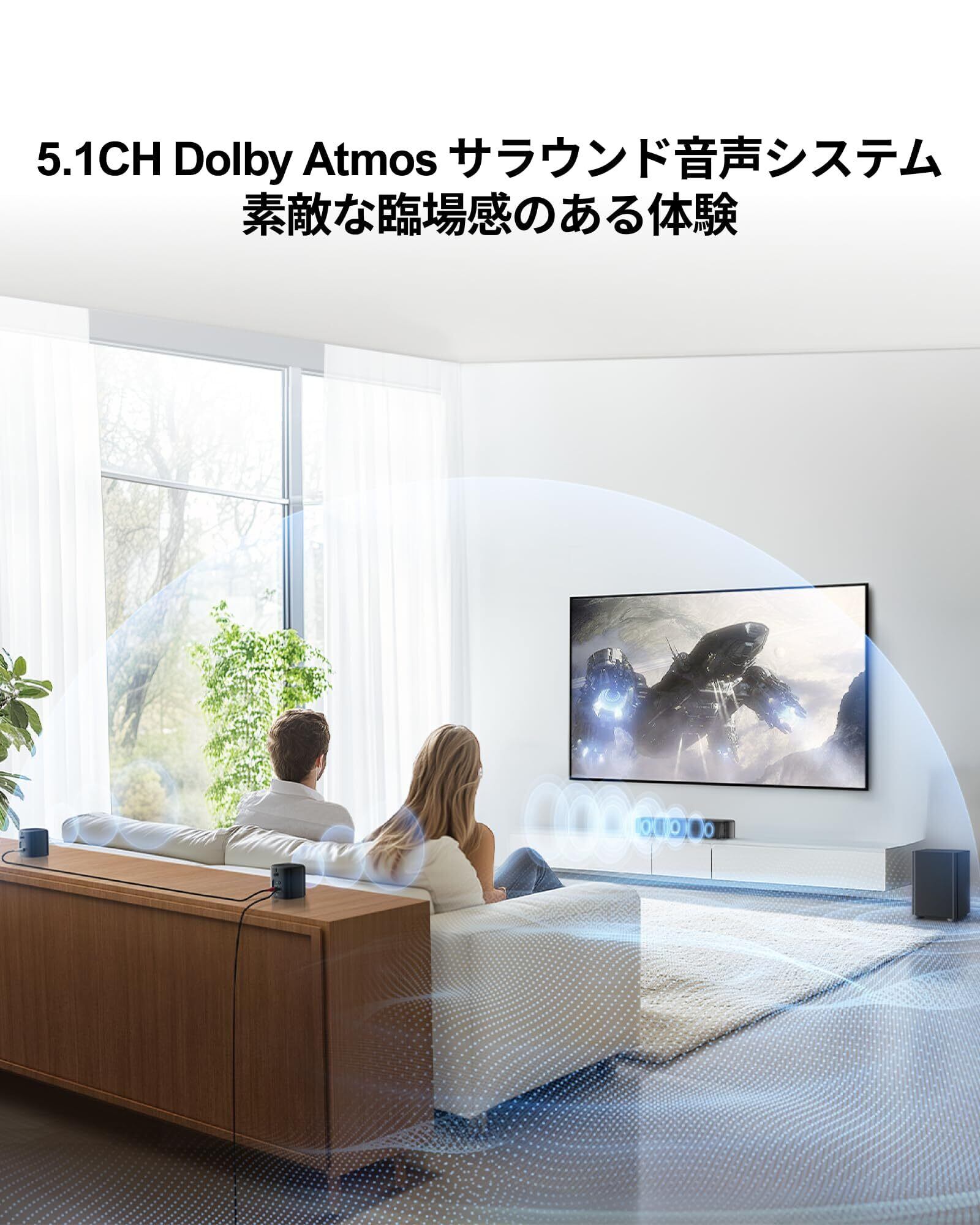【Dolby Atmos対応の3Dサウンド】Dolby Atmosテクノロジーにより、立体的で多次元なサウンドを実現。音の細部までクリアに再現し、臨場感を高めます。ホームシアターに最適な、価格以上の音質体験を提供します。