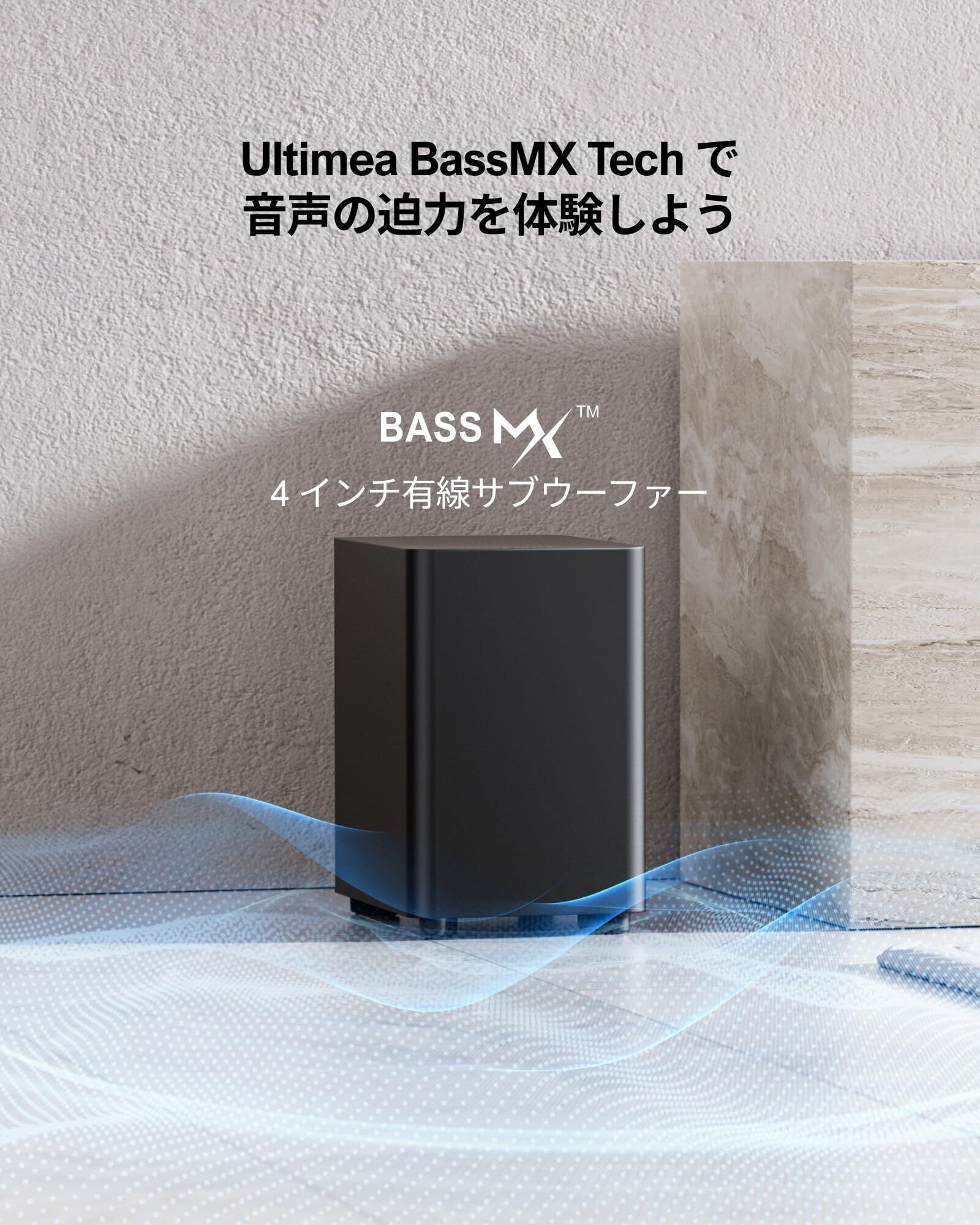 【BassMX技術】4インチ有線サブウーファーにより低音を強化。最適化された設計で深みのある重低音を再現します。アクションシーンや爆発音に圧倒的な迫力をプラス。