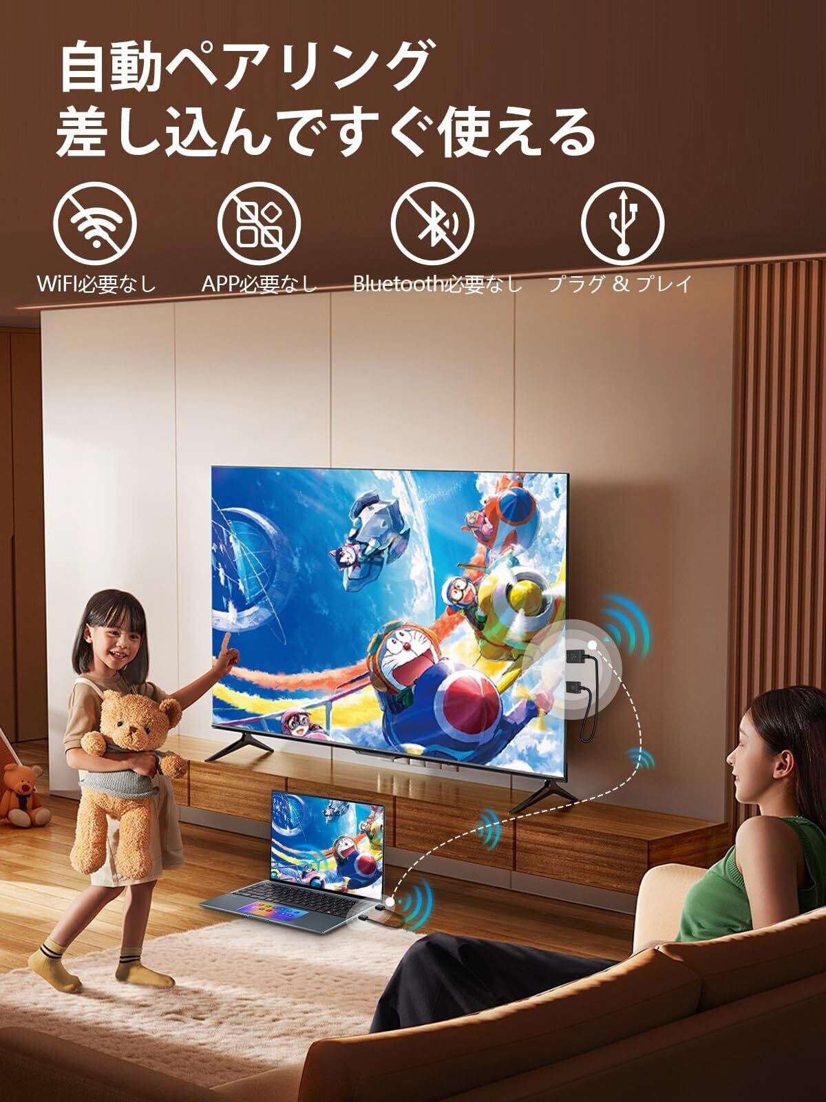 【1080P HD 高解像度】Moman CS6 ワイヤレスHDMI伝送セットには自動イコライゼーションシステムが内蔵されており、高解像度の1080P HD画質をサポートし、安定してクリアな映像や音声を出力します。映画、ドラマ、スポーツゲームをキャストでき、ホームシアターの楽しさを簡単に体験できます。それに、ミーティング、マルチメディア教育などのシーンでは効率を向上させます。