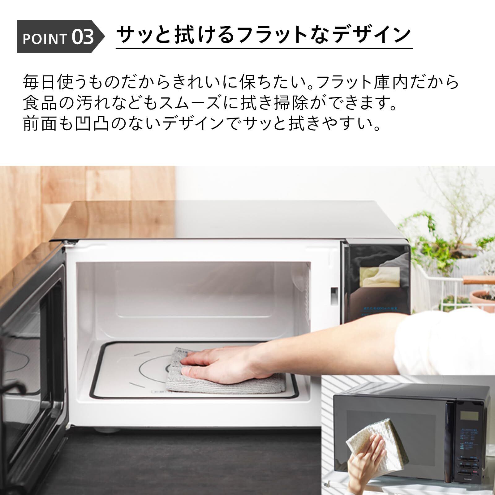 【便利なフラットタイプ】 庫内はターンテーブルのないフラット構造なので、コンビニ弁当などの大型の食材もあたためられます。さっと拭けて、お手入れもかんたんです。