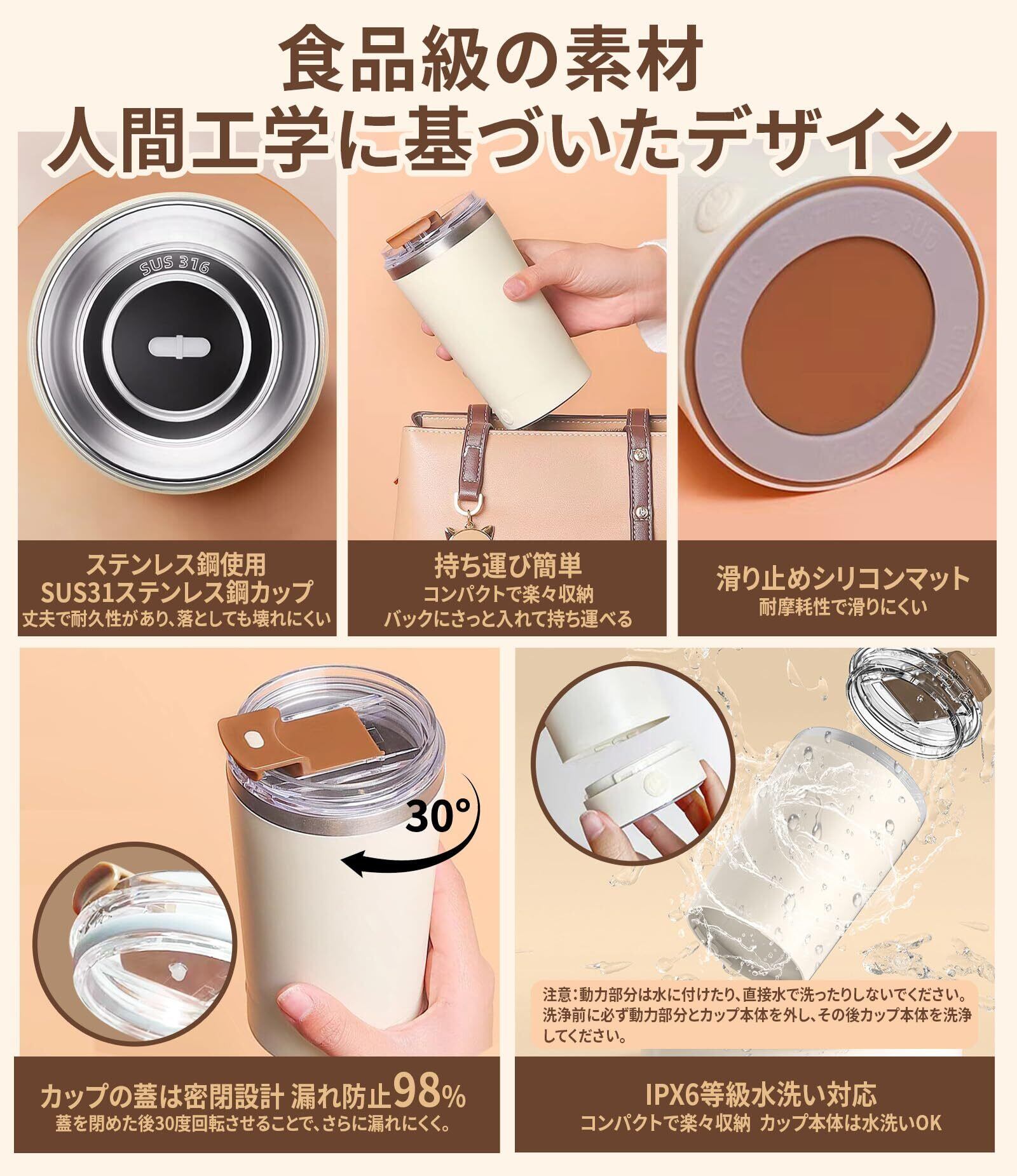 【大容量バッテリーと人間工学に基づいたデザイン】Anylice自動かき混ぜカップは、300mAhの大容量バッテリーを搭載しており、1回の充電で最大1ヶ月間使用可能です。カップ本体はコンパクトで、蓋には密封リングが設計されており、漏れ防止効果は98%に達しています。持ち運びにも便利で、外出時にも安心して使用できます。