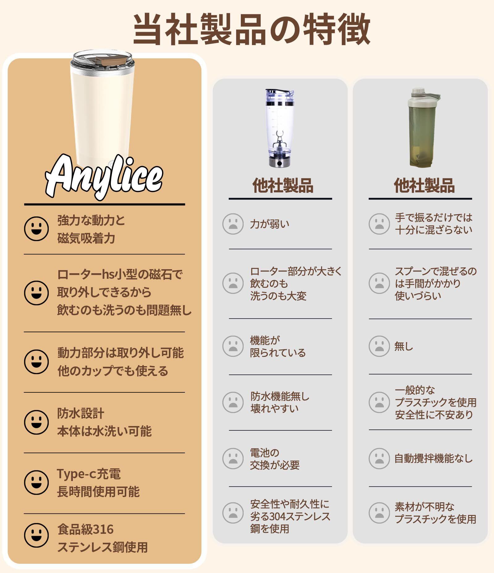 【自動かき混ぜ機能を持つ魔法のカップ】粉末状の飲料が完全に溶けない問題を一発で解決。Anylice自動かき混ぜカップは、磁力回転によって、カップ内の液体を毎分7000回転の強力な力でかき混ぜ、さまざまな飲料粉末を完全に溶かすことができます。スプーンを使ってかき混ぜる手間や、かき混ぜた後のスプーンの洗浄の面倒を解消します。
