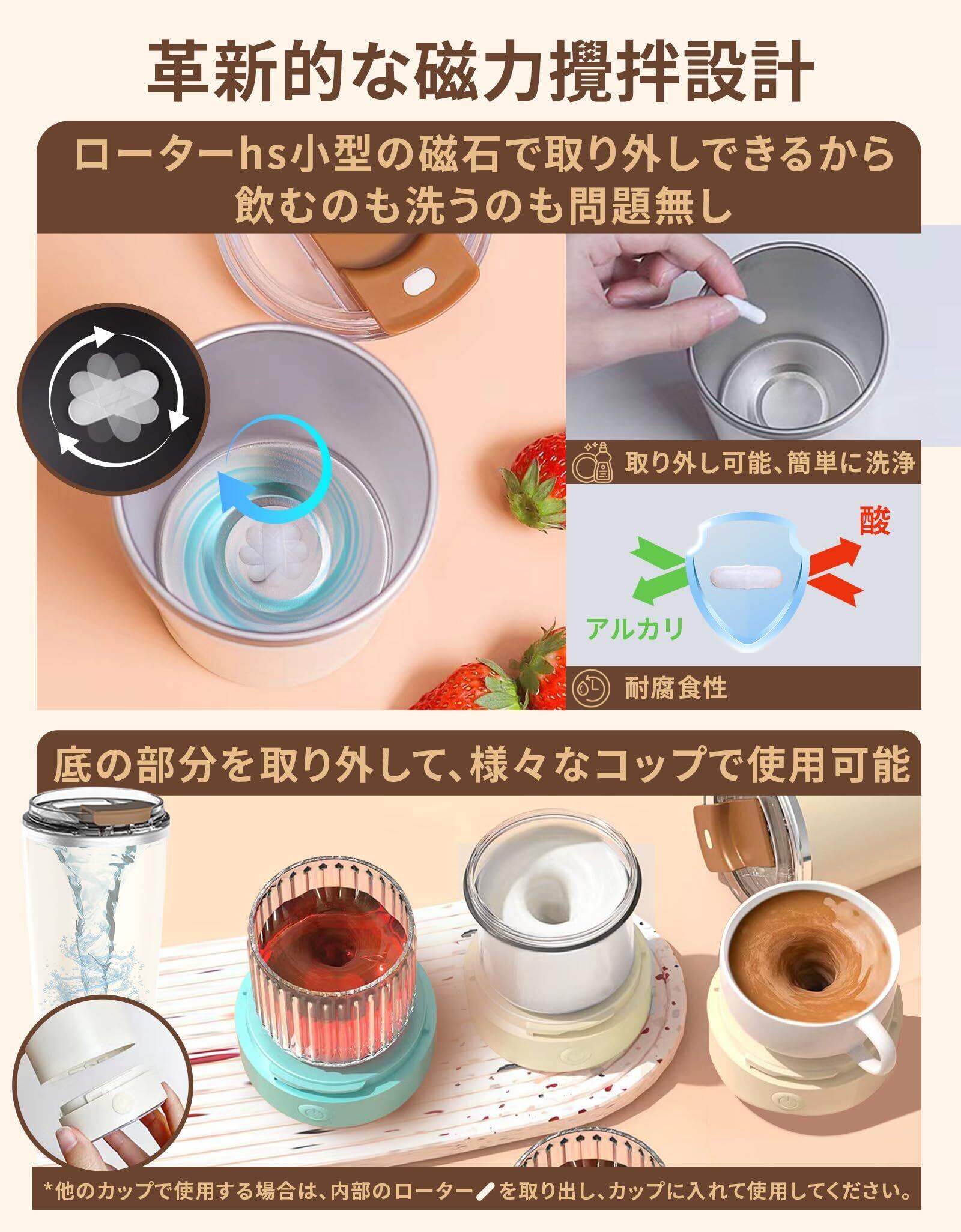 【革新的な磁力回転かき混ぜ設計】従来のかき混ぜカップは、底に大きくて長い固定されたかき混ぜ器具があり、飲み物を飲む際に口に当たることがあります。また、かき混ぜ器具は水垢が付きやすく、洗浄が面倒でした。Anylice自動かき混ぜカップは、革新的な磁力回転の原理を採用し、簡単に取り外し可能な磁力カップスタンドと磁力ローターを使用しています。かき混ぜた後、磁力ローターを簡単に取り外せるため、飲用や洗浄に全く支障をきたしません。また、磁力カップスタンドと磁力ローターは、取り外して他のカップでも使用することができます。(カップの厚さと容量によって効果が異なります)。