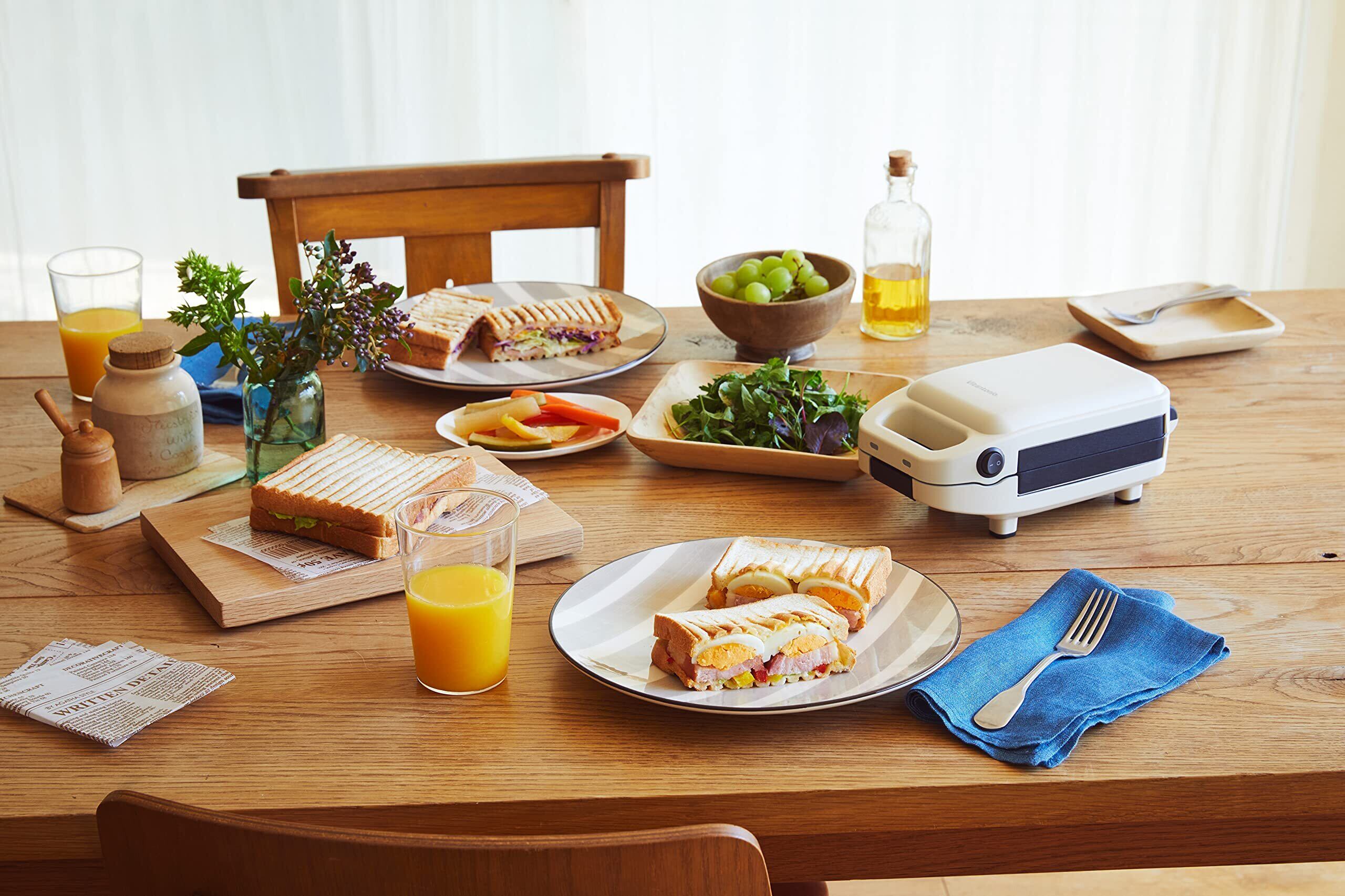 【耳付きホットサンドが焼ける】食パンのミミを切らずにそのまま焼けるゆとりのあるプレートサイズで、四辺がしっかりとプレスされるので、具材がこぼれにくく食べやすい!