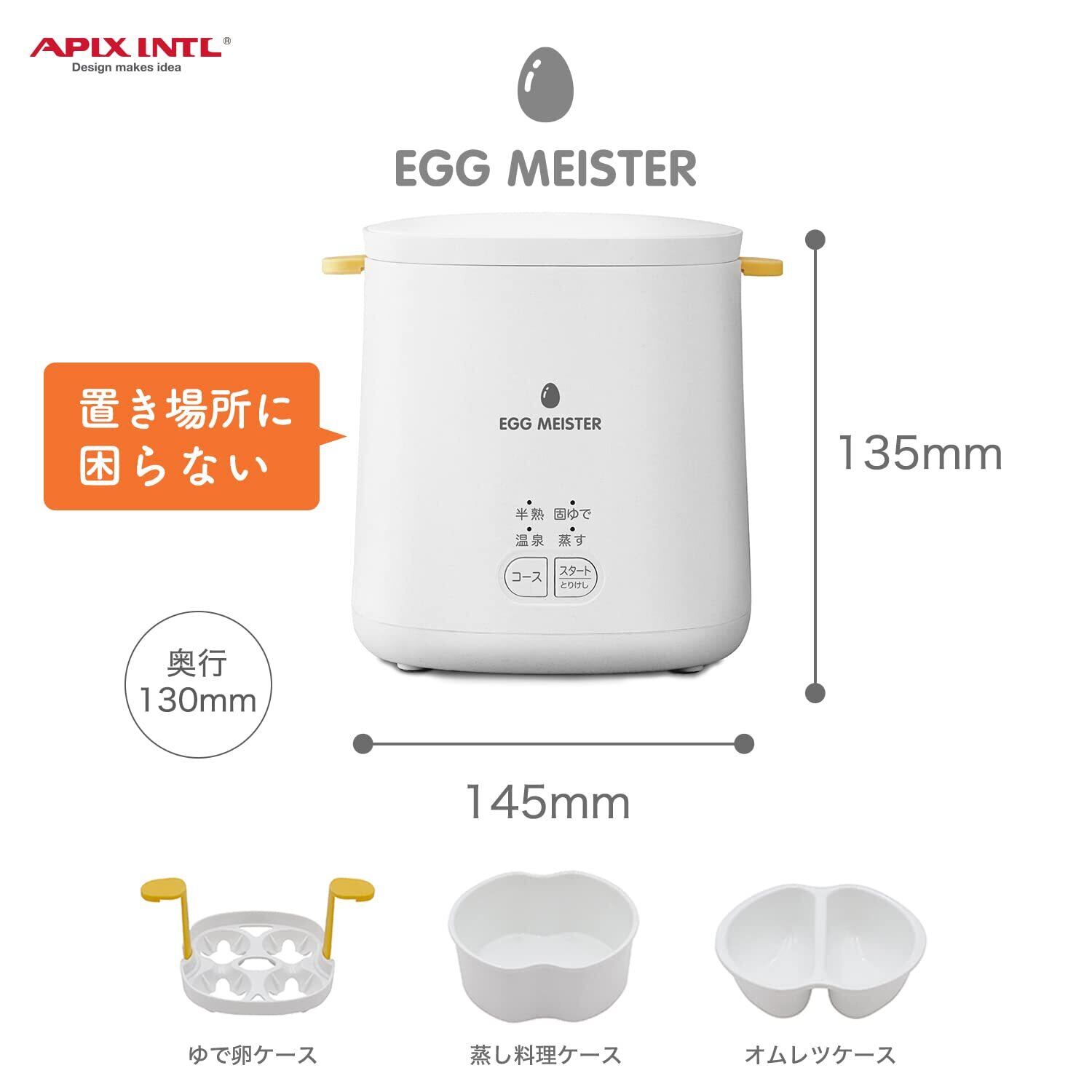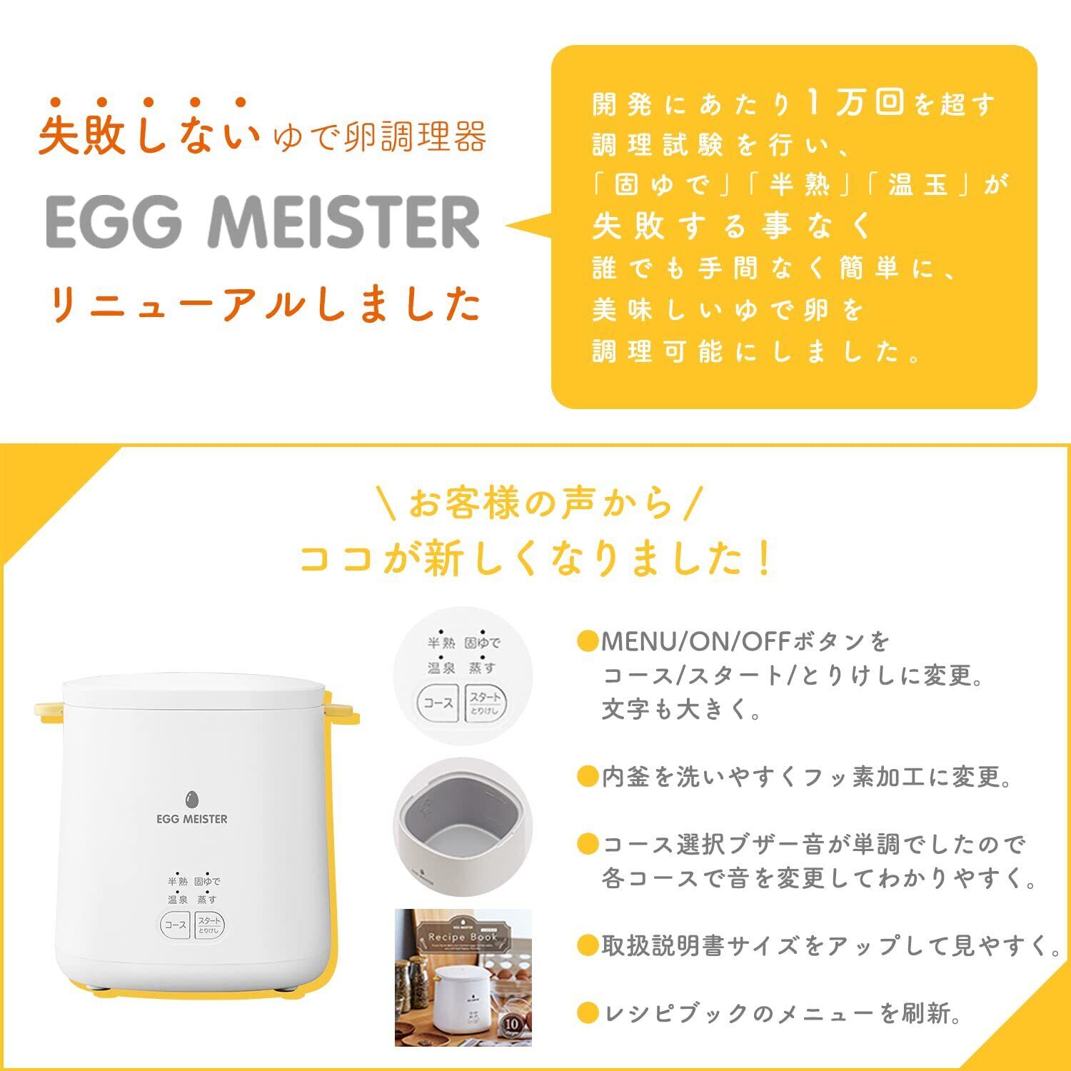 お客様の声を元に、アピックスのエッグマイスターがリニューアルしました! MENU、ON、OFFボタンをコースをコース、スタート、とりけしに変更。文字も大きく。内釜を洗いやすくフッ素加工に変更。コース選択ブザー音が単調でしたので各コースで音を変更してわかりやすく。取扱説明書サイズをアップして見やすく。レシピブックのメニューを刷新。