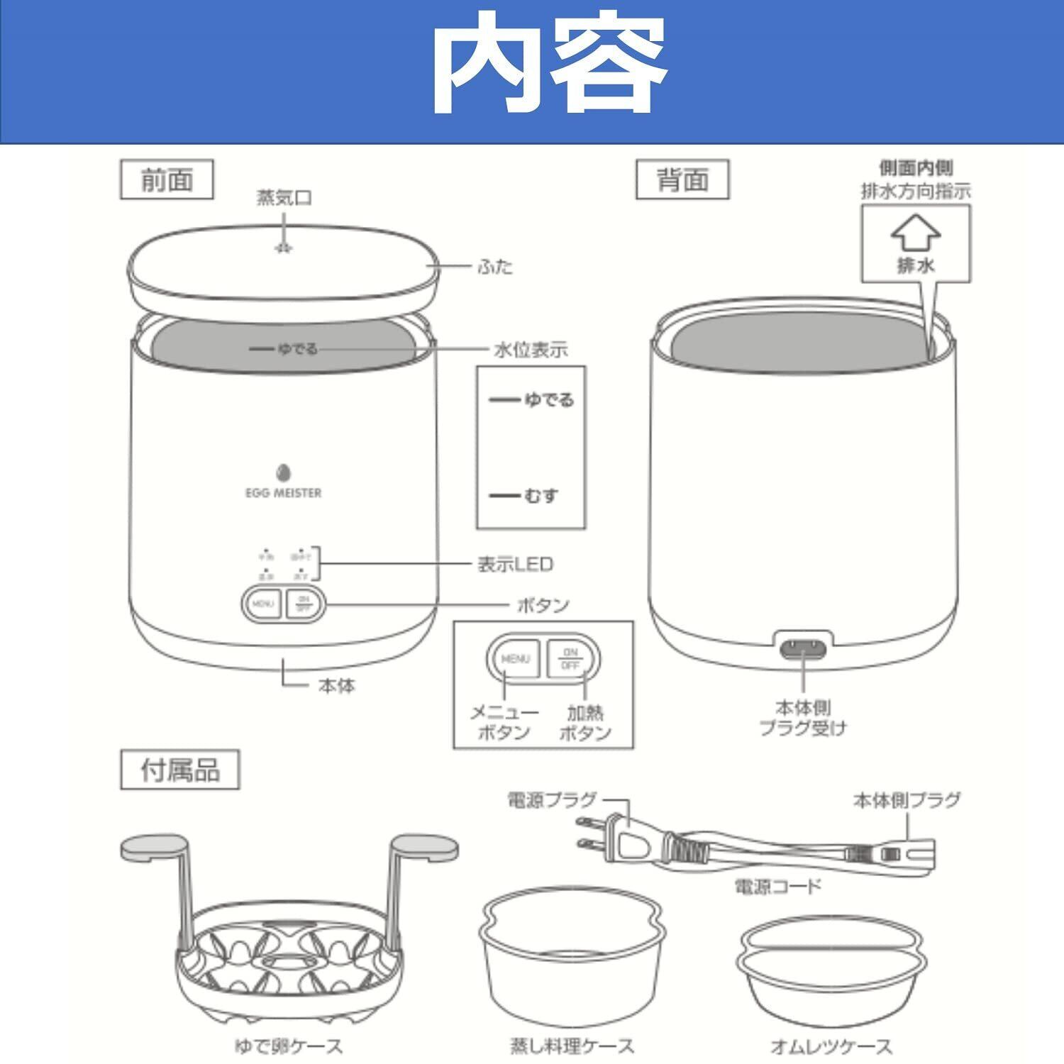 付属品:ゆで卵ケース オムレツケース 蒸し料理ケース 電源コード レシピブック