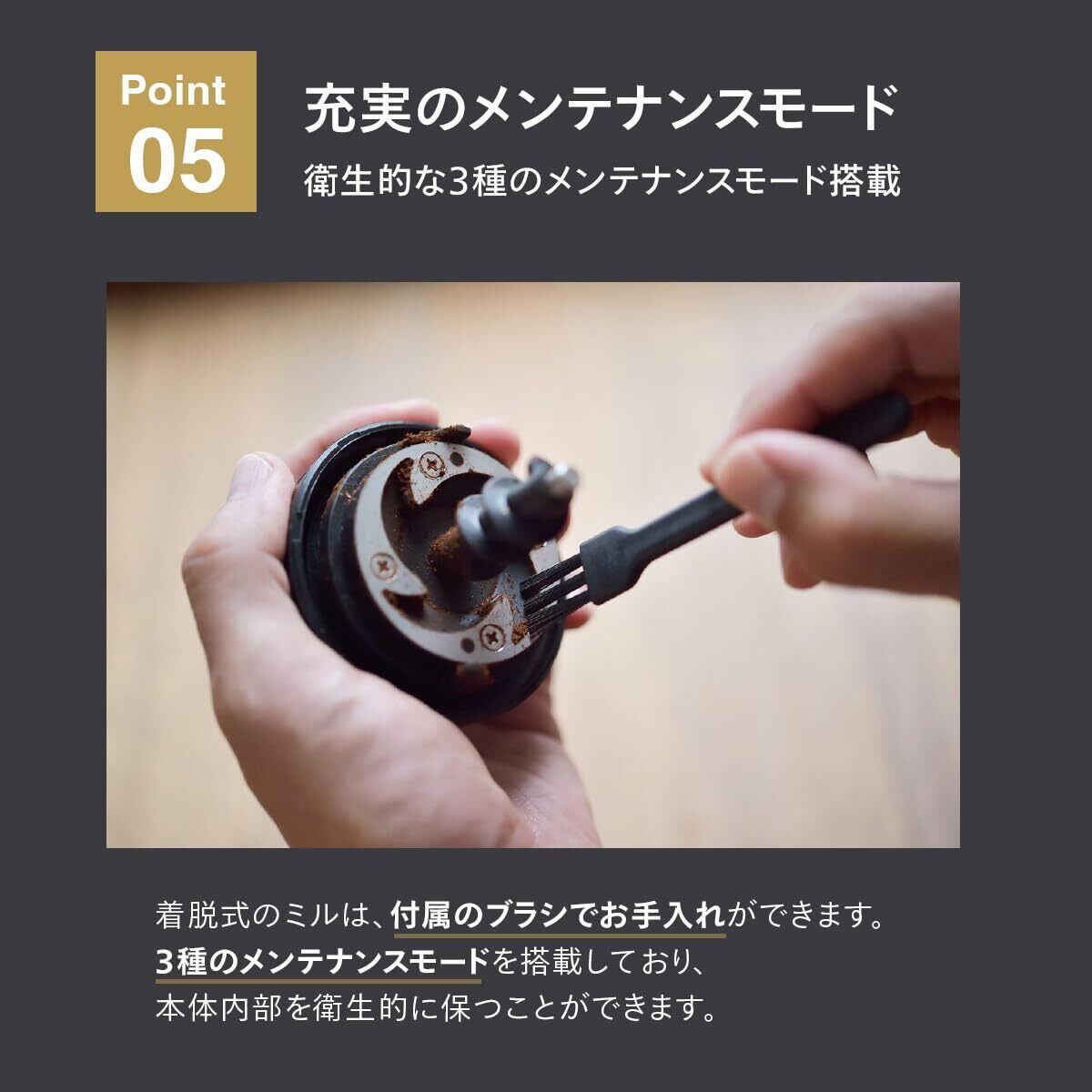 カフェ・バッハ店主 田口護氏監修。取り外し可能ミルを採用。挽き方は豆の焙煎度や好みに合わせて3段階(粗/中/細)に設定可能。