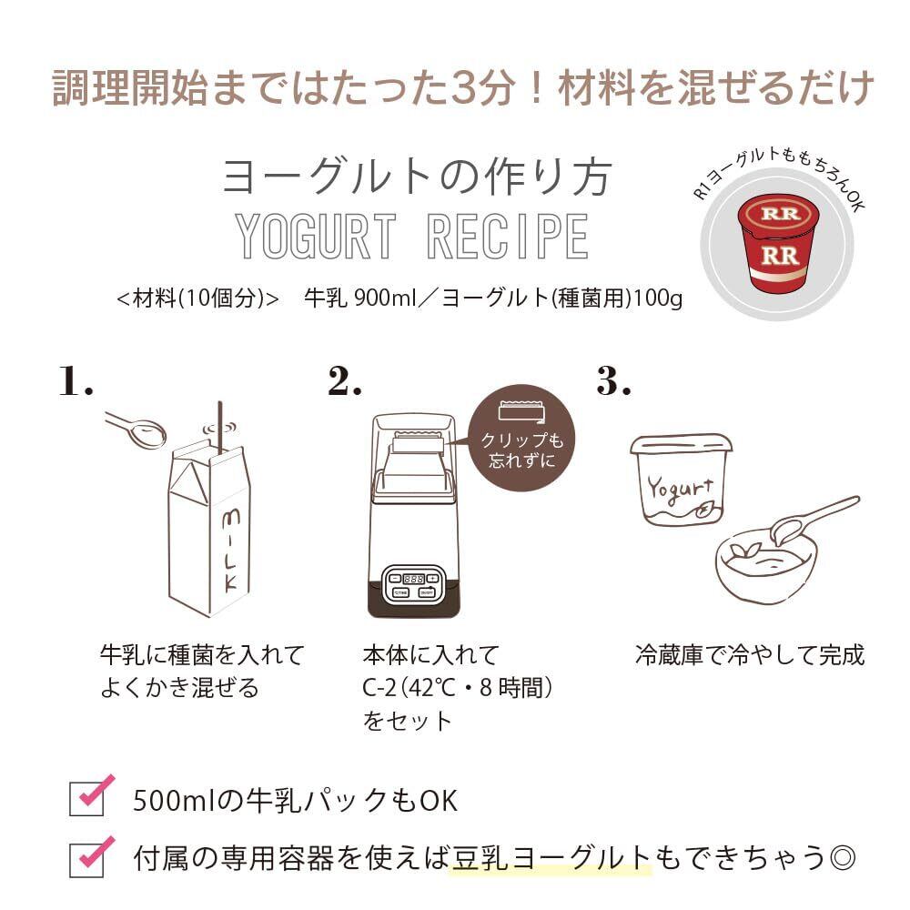 【特徴】■万能調理器 ヨーグルトや発酵食品などがこれ一大で手軽に作れる万能なヨーグルトメーカーです。 ■牛乳パックをそのまま 専用容器の使用はもちろんですが、市販の牛乳パック(1L)もそのまま使用できるのでより手軽にヨーグルトが作れます。 ■レシピブック付き 初めてでも手軽に調理ができるよう、12種類のレシピを掲載したレシピブック付き。