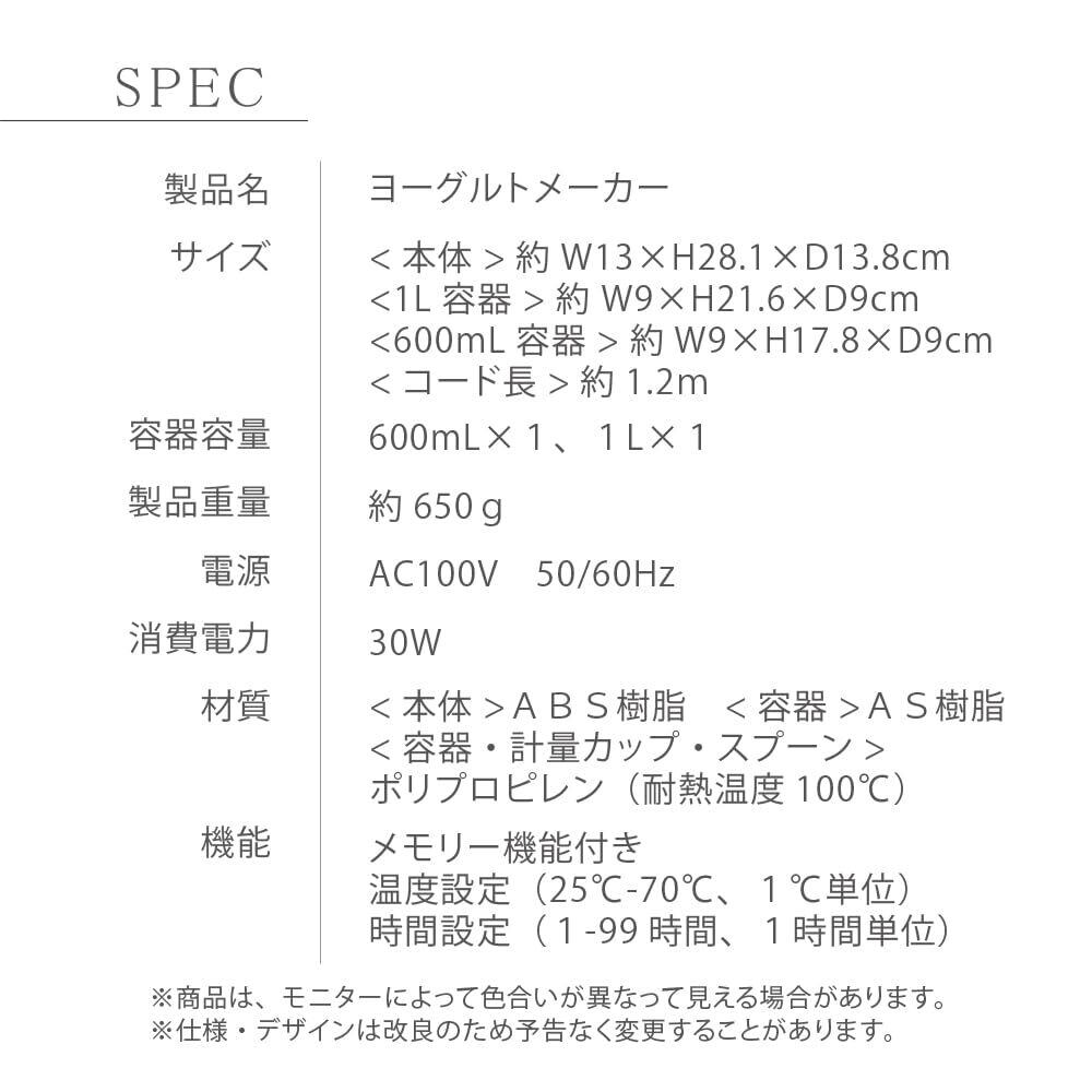 【セット内容】 ヨーグルトメーカー本体 / レシピ本 / 専用容器1L / 専用容器600ml /スプーン×1(約24cm)/ 計量カップ / 牛乳パック用クリップ / 6ヵ月製品書付取扱説明書