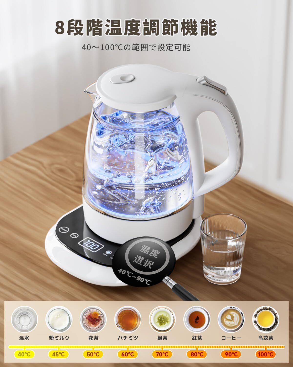 【8段階温度調整&24時間保温】5℃ずつの温度調整(40/45/50/60/70/80/90/100℃)が可能で、コーヒーや紅茶など多様な飲み物に最適な湯温で淹れることができ、飲み物本来の風味を最大限に引き出せます。保温機能付き電気ケトルはいつでも適温のお湯を使えます。赤ちゃんがお腹を空かせて泣き始めて忙しい時ほど、無駄な動きは減らしたいです。一度沸かせば、最長24時間まで温度を持てるから、朝に沸かして夜までそのまま使えます。
