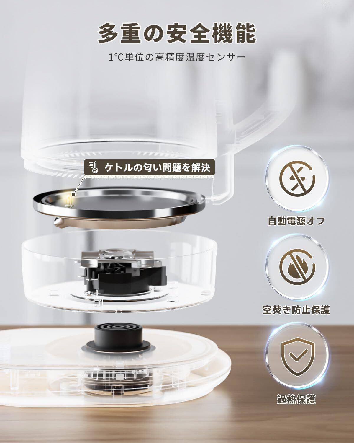 【高品質の温度センサー&安心の三重保護】ガラスケトルは沸騰後に自動で電源がOFFになる機能や、温度が上がりすぎるのを防ぐ過熱保護、お湯が入っていないと電源がOFFになる空焚き防止機能などの安心機能を搭載。ご家族に健康で安全な生活を与えたい方にとって最良のガラスケトル!