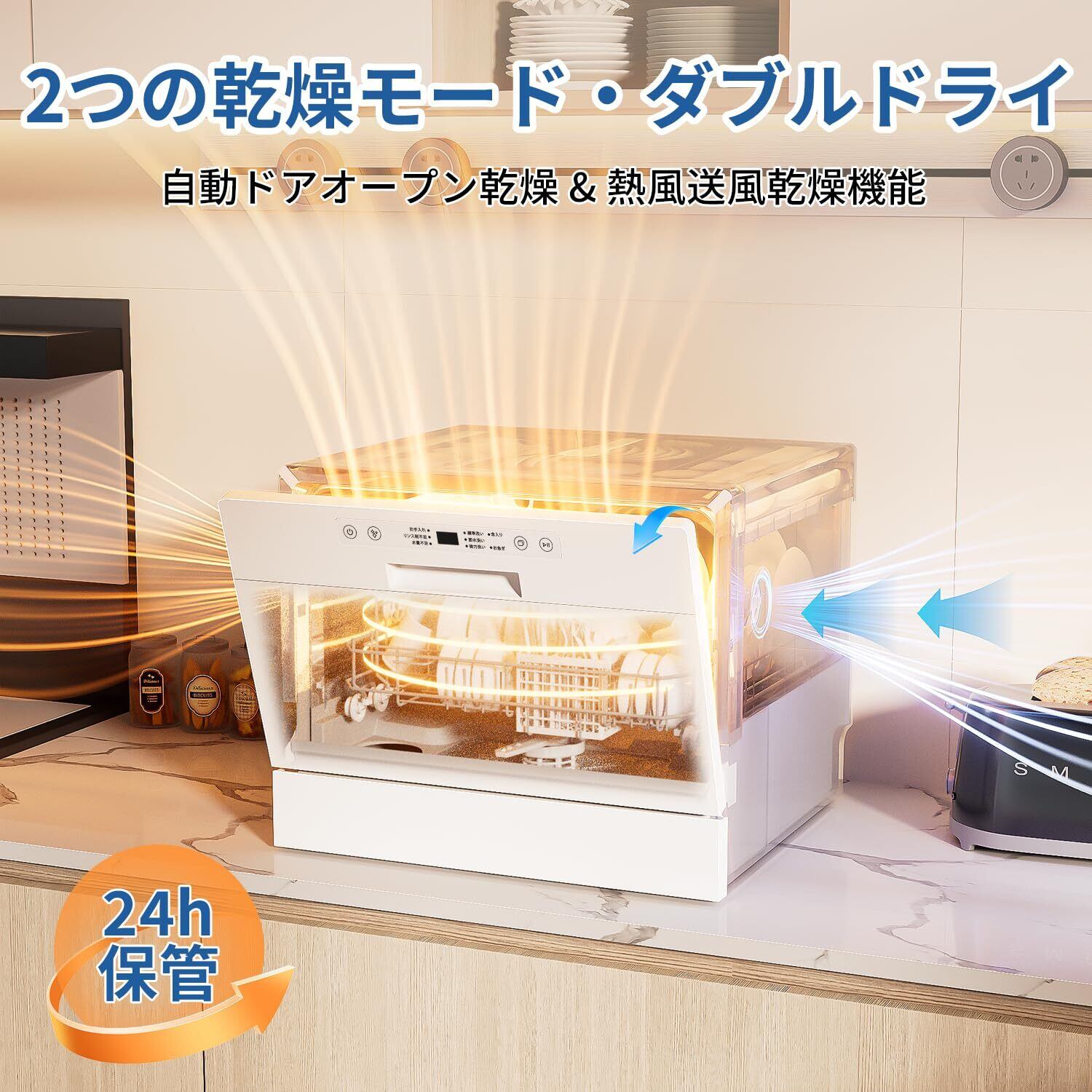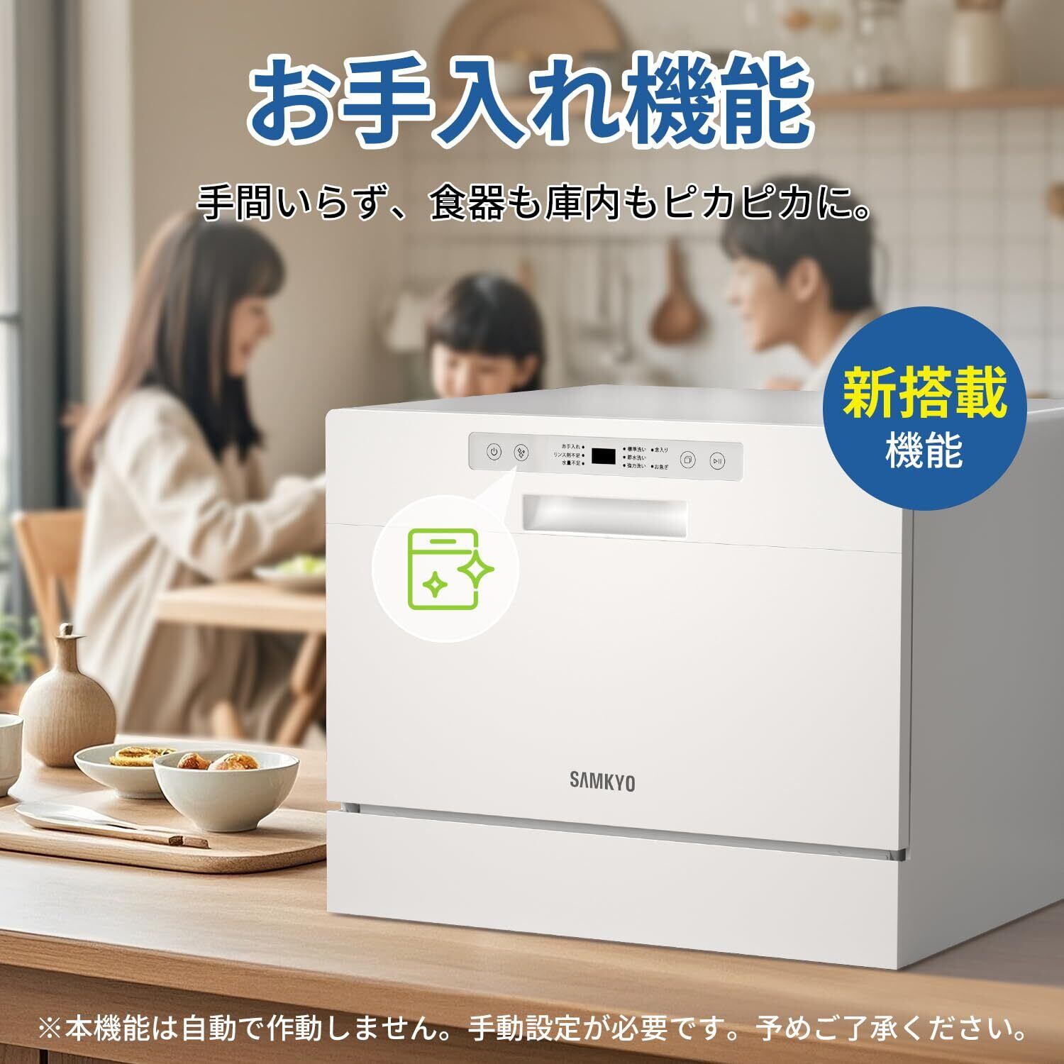 【3D熱風送風乾燥・最大24時間のトライキープ】●洗浄だけで送風乾燥がなければ、厳密に言えば食器洗い乾燥機とは呼べません。洗浄後でも濡れたままで、手洗いとほぼ同じです…なお、細菌やウイルスが付着しやすく、食器を介して体内へ侵入することも可能です。●SAMKYO食洗機T60は3D熱風乾燥機能を搭載しており、乾燥期間に熱風を庫内に送り込み、食器を乾いた状態に保ち、バクテリアを効果的に抑制できます。●最大24時間のトライキープを設定できます。熱風送風乾燥時間の延長とも言えます。その期間は、定期的な換気を行い、食器を乾燥状態を持続させてくれます。常に清潔な状態に保ち、機械の臭いを防ぎます。(※注意:本機の乾燥機能は、洗浄終了後に自動的に実行され、「乾燥のみ」機能は備えておりません。)