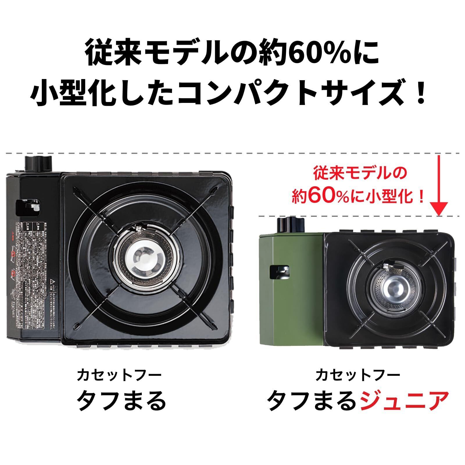 【タフまるジュニア7つの特徴】①従来モデルより60%の小型化。②ダブル防風ユニット。③炎が消えにくい炎長が短い多孔式バーナーを採用。④アルミダイキャスト製スタンド。⑤耐重量10kg・ダッチオーブンOK。 ⑥ケース付きで持ち運びお便利。⑦イワタニカセットガス、カセットガスジュニア両サイズのカセットガスが使用可能。【安全機能も多数備えている】①マグネット着脱式②ボンベ加湿機構③圧力感知安全装置④容器装着安全装置