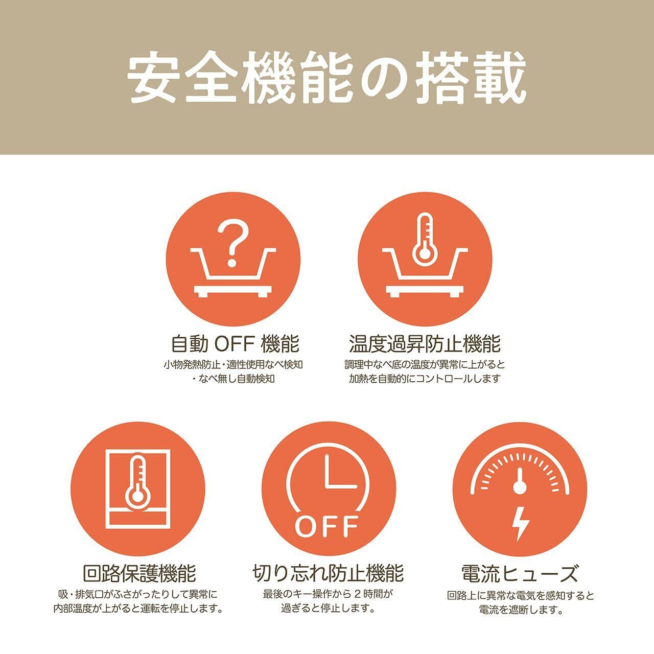 ・安全装置:自動OFF機能/温度過昇防止/回路保護機能/切り忘れ防止機能/電流ヒューズ
