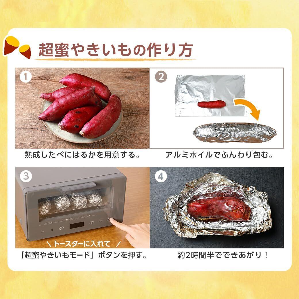 より簡単に密たっぷりのやきいもが焼けるサツマイモからしっかり糖度を引き出し、蜜たっぷりのやきいもを焼ける!やきいも好きのためのトースターとして人気の『超蜜やきいもトースター』がバージョンアップ!機能はそのままに、専用ケースを使わずより簡単に焼けるよう改良しました。専用ケースをなくしたことで、様々なサツマイモでのやきいもも楽しめるようになりました。プロが焼いたような美味しいやきいもを、自宅で簡単に焼くことができます。