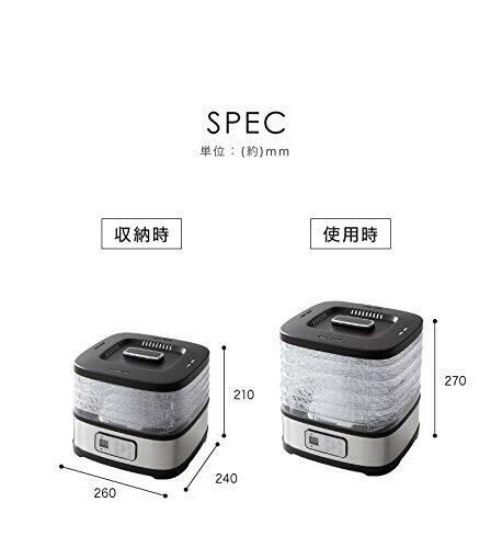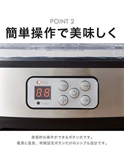 【簡単操作で美味しく】直感的な操作ができるボタン式です。電源と温度、時間設定ボタンだけのシンプル設計です。温度設定:35~70℃(5℃刻み)切タイマー:1~16h(1時間刻み)しっかり乾燥。本体下部のファンから温風を送り続け、網上のトレイに乗せた食材を効率よく短時間で乾燥させます。【大容量5段トレー】段によって食材を分けたり、つくり置きもできちゃうたっぷり大容量な5段トレーです。収納時もスッキリ。トレーに付いているツメは向きを180度変えると高さが変わる仕組みです。収納時はスッキリコンパクトに。【その他のポイント】フタは持ちやすいよう取っ手が付いています。電源コードは90cmです。フタ・トレーは水洗いすることが可能です。