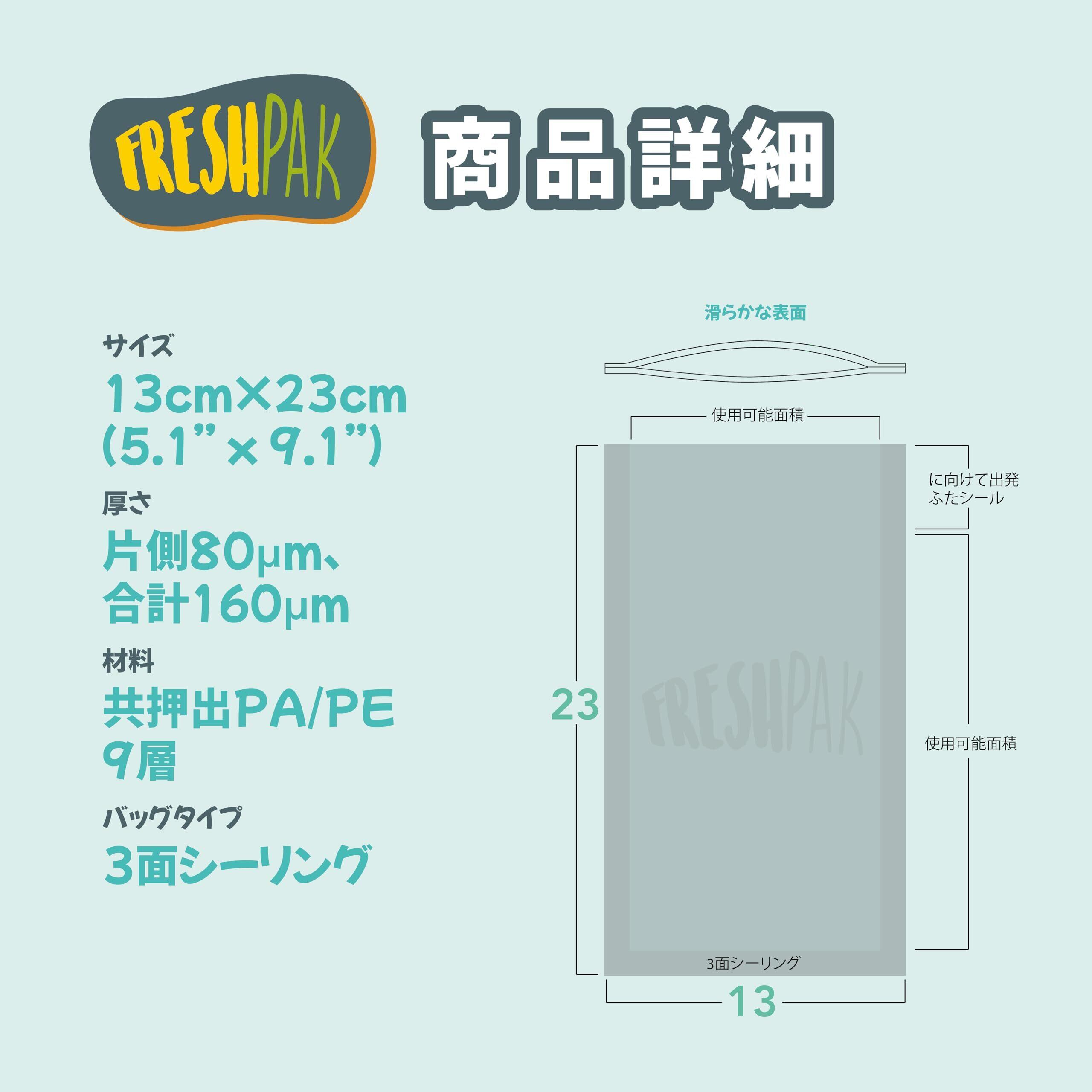 真空パック 袋 真空パック機専用袋 FRESHPAK スムーズ エンボス加工無し 13x23cm (5.1x9”) 80μ 100枚入り 真空袋 高強度五層/三方規格袋 ✩ ナイロンポリ袋✩機専用袋 鮮度長持ち 食品保存 電子レンジ解凍 PA+PE安全素材 専用袋 業務用 家庭用 冷凍保存 [SF-1323-1]