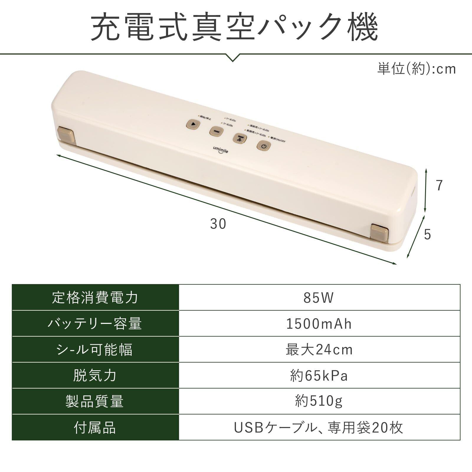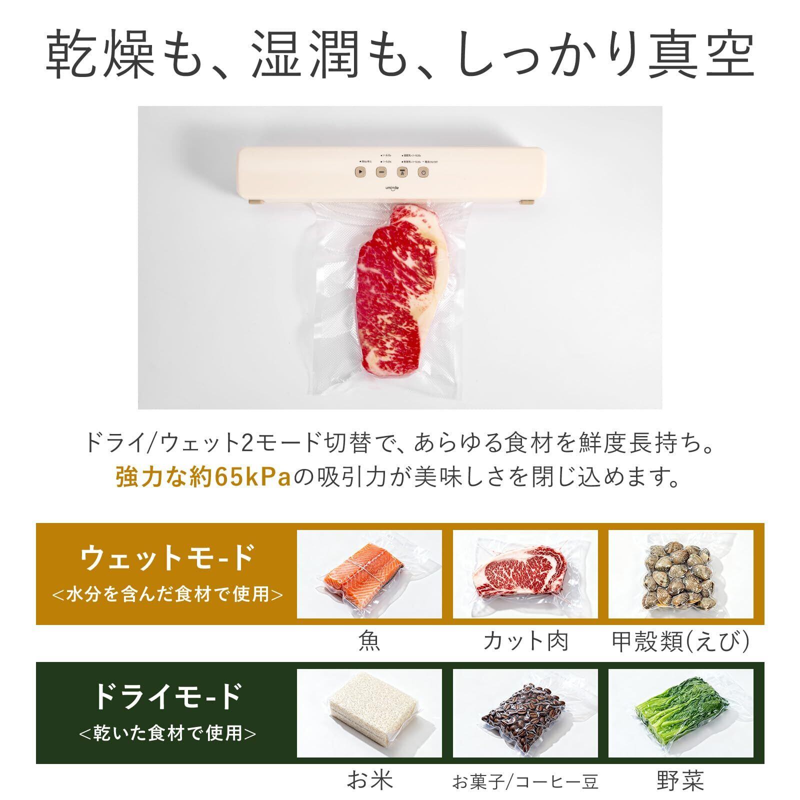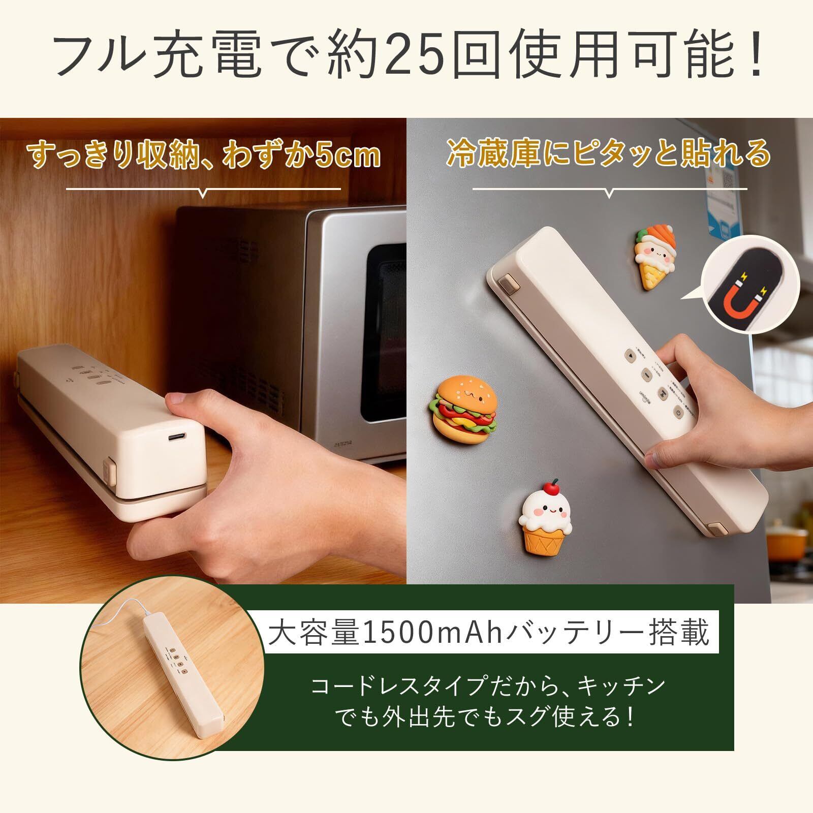 Umimile 真空パック機 充電式 専用袋20枚付 磁気収納可能 コードレス フードシーラー 65kPa 強力吸引 乾燥物/汁気物/手動脱気/シールのみ 24cmの密封長さ 軽量 高耐久性 鮮度長持ち 操作簡単 お手入れ簡単 12ヶ月品質
