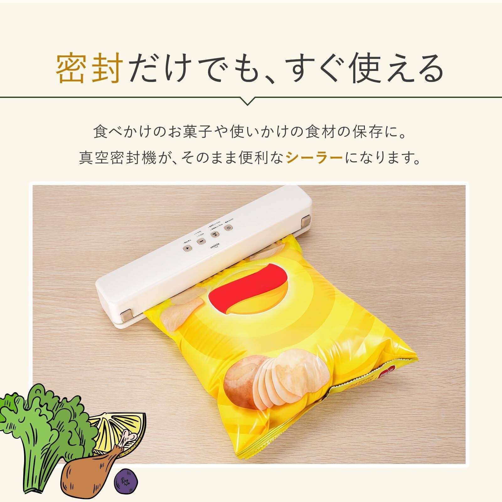 【安心の日本語サポート】真空パック機本体に加え、専用袋20枚と日本語説明書を同梱。1年で初心者でも安心してお使いいただけます。