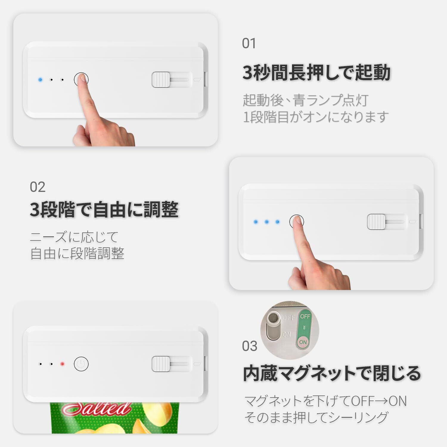 【三階段調整&操作簡単】 専用袋が不要な3段階温度調整機能を搭載し、薄手のポリ袋から保存容器用パウチまで幅広い素材に対応。電源ボタンを3秒長押しで起動すると自動的に弱モード(1段階)に設定され、本体上部のヒートプレートを押すたびに「弱→中→強」と段階が切り替わる直感的設計。上蓋のヒートプレートを押して加熱している間はLEDインジケーターが赤く点灯し、手を離すと即座に動作停止する安全機構を採用。面倒な設定不要で、スイッチ押圧→温度選択→密封完了という3ステップが5秒で完了する、初心者でも瞬時に習得可能なシンプル構造です。
