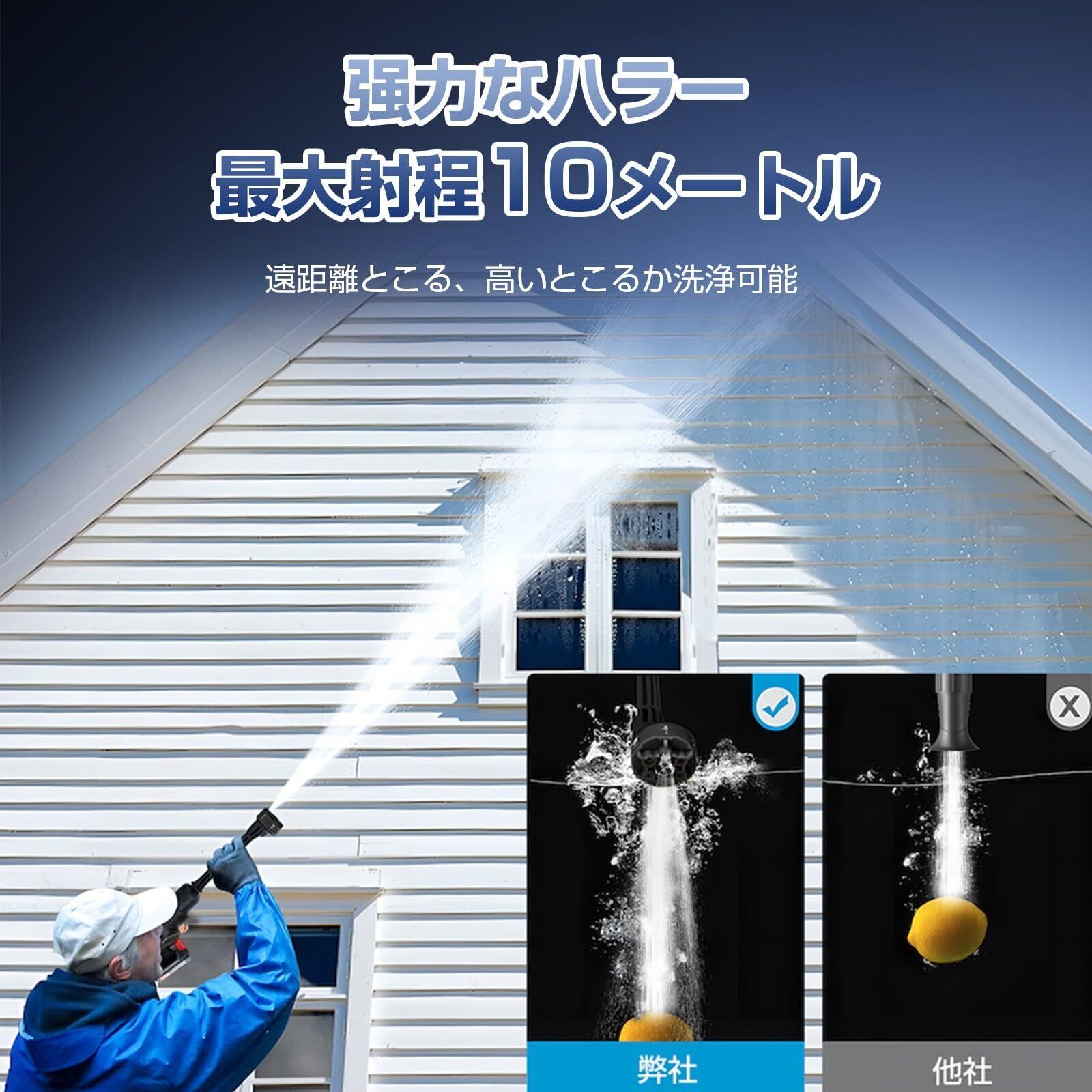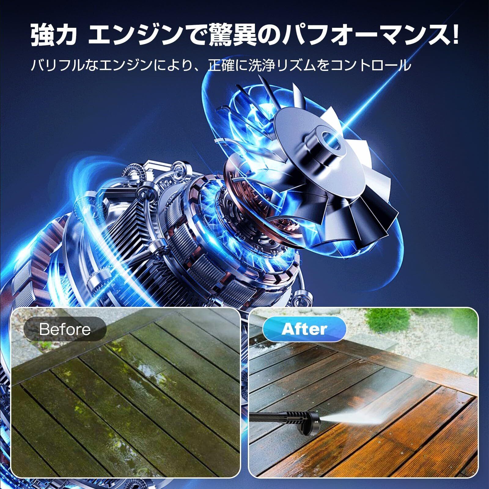 【洗車も掃除もこれ一台!超強力コードレス高圧洗浄機】高効率750Wの純銅ブラシレスモーターを採用し、水道圧の約40倍に達するハイパワー噴射を実現。頑固な泥汚れや油汚れも一気に吹き飛ばします。独自設計の高圧ポンプにより安定した水圧を維持し、他社モデルよりも約20%高い洗浄力を発揮。最大10mの射程で広範囲を効率的に洗浄でき、車2台分の洗車も短時間で完了。高圧洗浄により水の無駄を減らし、従来より最大20%の節水効果を実現します。