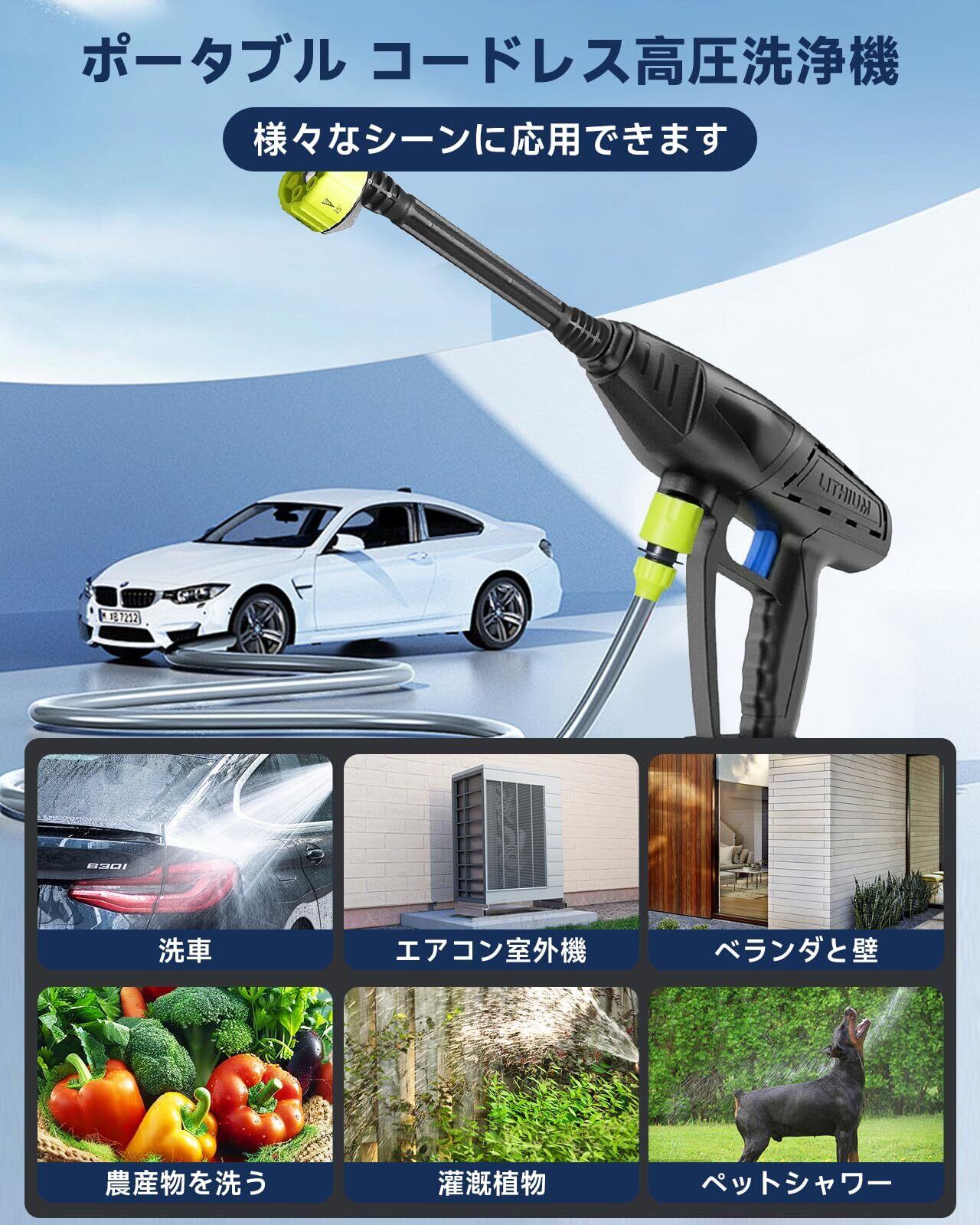 【効率的に洗浄】高圧洗浄機の魅力は、水をかけるだけで簡単に掃除できることです。66.9%の水使用量を削減しながら、頑固な汚れを強力な水圧でしっかり取り除きます。この高圧洗浄機は壁の隅の隙間でも、車のタイヤのホイールでもきれいに洗浄でき、庭の花やペットのお風呂や水遊びにも使用でき、5 mのホースが装備されているため、水を戻すことはできません エレクトロニクス。 【複数の適用シーン&使い勝手】給水ホースをバケツや池に入れた水を汲むだけで、水のある場所でも使える高圧洗浄機です。フィルターはろ過機能があるため、湖、川、貯蔵された雨水にも使用できる。同時に私たちは水道代を節約することができます。5メートルの軟水管も備えており、水の汲み取りや移動に便利です エレクトロニクス。 【6in1 多機能ノズル】このコードレス高圧洗浄機は0°/15°/25°/40°/シャワー/ファンなど6種類のモードを1つのノズルに合わせた。ノズル先端を回転させることで噴射角度を切り替えます。洗車、ガーデン、アウトドア、階段、網戸と窓ガラス、レンガ壁【6in1 多機能ノズル】このコードレス高圧洗浄機は0°/15°/25°/40°/シャワー/ファンなど6種類のモードを1つのノズルに合わせた。ノズル先端を回転させることで噴射角度を切り替えます。洗車、ガーデン、アウトドア、階段、網戸と窓ガラス、レンガ壁、外壁、駐車場、玄関、自転車とバイク、ベランダ、高台、家の周り、年末の大掃除、キャンプ用品の清掃、BBQの清掃など、さまざまな洗浄シーンに適応することができます。発泡ガンモードに変更することもでき、洗浄剤をボトルに入れて高圧洗浄機に取り付けるだけで、使いやすい エレクトロニクス。、外壁、駐車場、玄関、自転車とバイク、ベランダ、高台、家の周り、年末の大掃除、キャンプ用品の清掃、BBQの清掃など、さまざまな洗浄シーンに適応することができます。発泡ガンモードに変更することもでき、洗浄剤をボトルに入れて高圧洗浄機に取り付けるだけで、使いやすい エレクトロニクス。 【安全性と信頼性&高いアフターサービス】洗車店監修!信頼性の高い高圧洗浄機は新たにアップグレードされたブラシレスモータを搭載し、多種のノズルヘッドに合わせて、どんな頑固な汚れも洗浄することができます。製品は90日間の品質を享受して、私達は優秀な製品のアフターサービスチームを持って、いかなる製品の使用あるいは品質の問題、あなたがすぐに私達と連絡することができること(Tips:製品出荷時に様々な機能や細部の検査を経て、水汚れが出るのは正常な現象です。ご不満の場合は、オペレーターにご連絡いただき返品・返金をお願いいたします) エレクトロニクス。