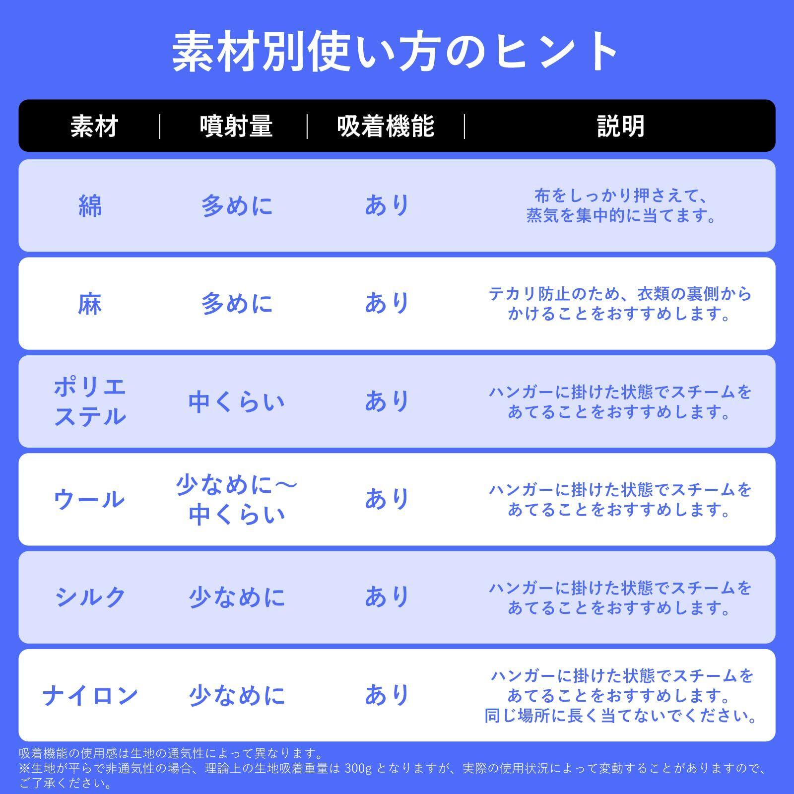 【吸着力は3段階】吸着力は、「強・弱・OFF」の3段階。デニム・コートなどの厚手の生地は「強」、綿・麻などの一般的な薄手の生地は「弱」、フリル、プリーツが入った部分は「OFF」といった具合に、素材に合わせて調節可能。