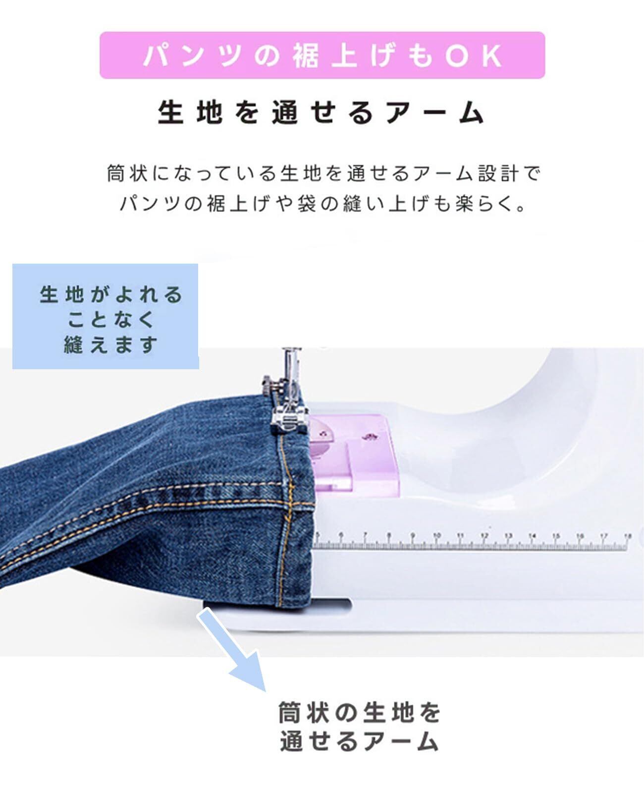 【筒モノの縫い方】:服を縫いの便利のために、専用のアーム部があります、筒ものをアーム部に通して縫い進めます。袖やズボンのすそなどの筒ものを縫うことができます。このミシンは下糸巻き取りの機能があります。