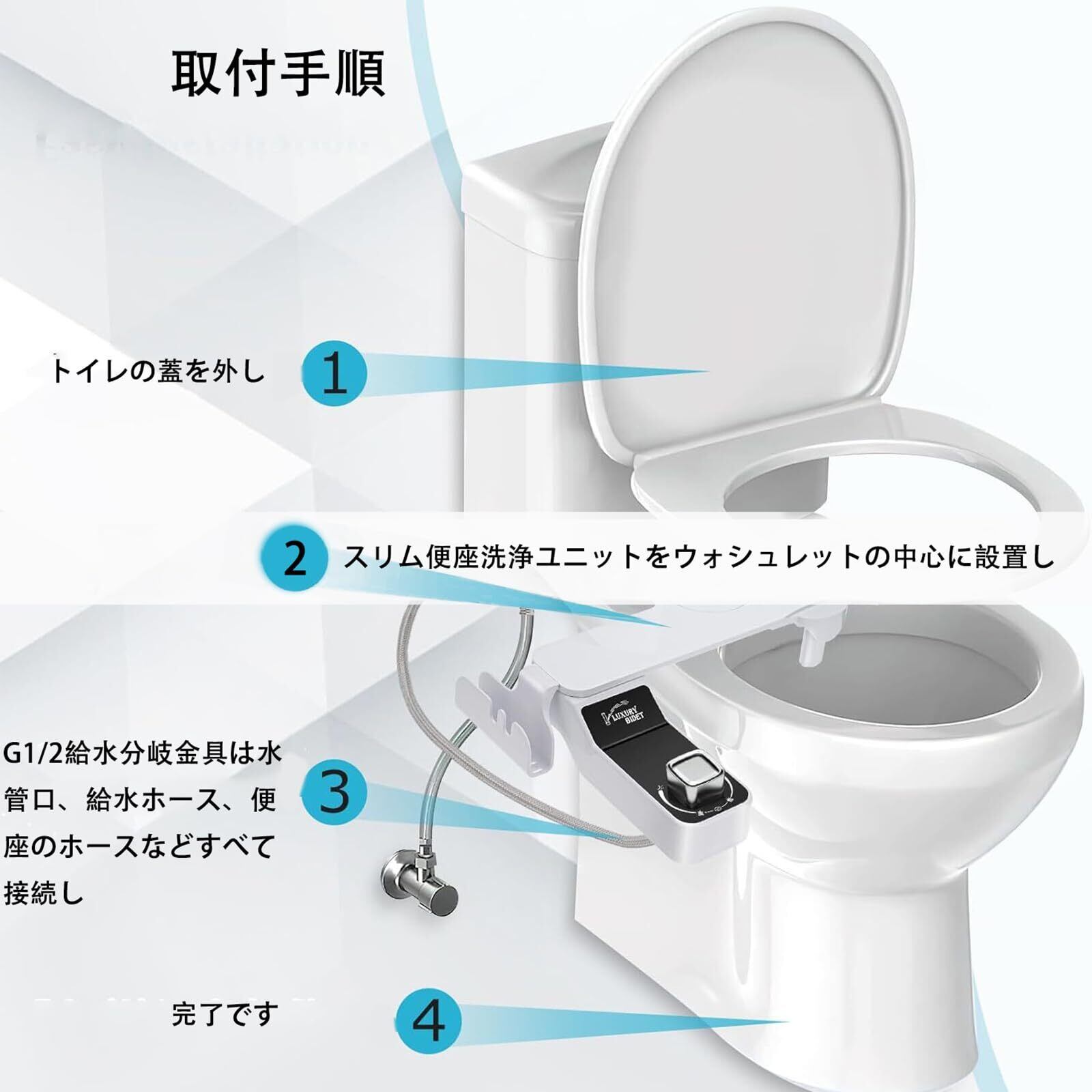【取付方法】組立:スリム便座洗浄ユニット本体は折りたたみ可能で、半分です。スライトで、簡単に組立完了、スマホホルダーにも!取付:1.トイレの蓋を外し。2.スリム便座洗浄ユニットをウォシュレットの中心に設置し。3.トイレの蓋を戻って、ネジを締め切り。4.G1/2給水分岐金具は水管口、給水ホース、便座のホースなどすべて接続し完了です。