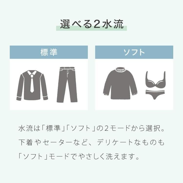 【パワフル洗浄】水流回転方向が自動で切り替わる強力洗浄です。パワフルな撹拌力で手洗いでは手間のかかる汚れもすっきり落とします!水流は「標準」「ソフト」の2モードから選択できます。下着やセーターなど、デリケートなものも「ソフト」モードで優しく洗えます。